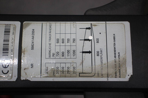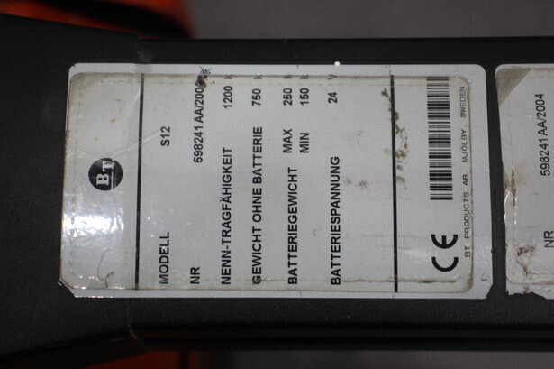 Brand: BT Type: S12 Serial number: 598241AA Year of construction: 2004 Fuel: Electric Mast type: Duplex Lifting capacity: 1200 kg Lifting height: 3700 mm Reading operating hours: 931 h Machine weight: 1000 kg Color: red