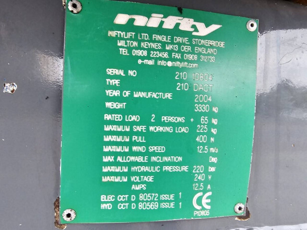 Brand: Niftylift Type: 210 Serial number: 210 10804 Year of construction: 2004 Fuel: Diesel Load capacity: 225 kg Working height: 21 m Number of axles: 1