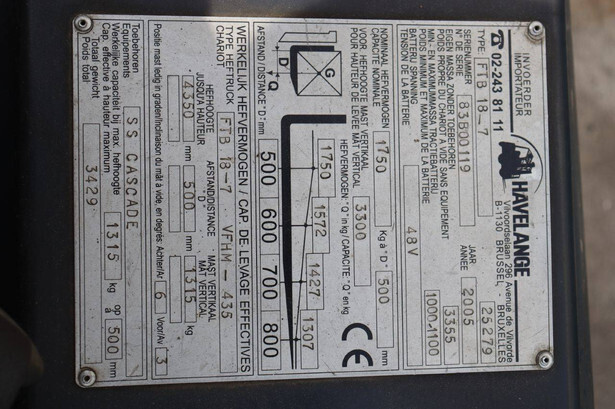 Brand: TCM Type: FTB 18-7 Serial number: 83B00119 Year of construction: 2005 Fuel: Electric Mast type: Plywood Sideshift: Yes Lifting capacity: 1750 kg Lifting height: 4350 mm Recorded operating hours: 4562 h Tires: Solid tires Color: yellow