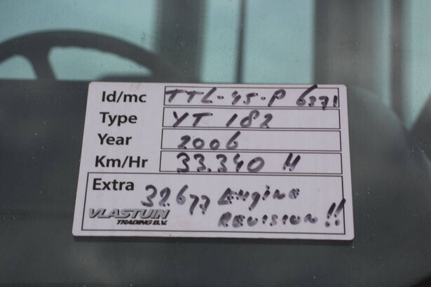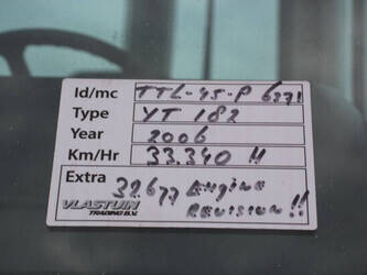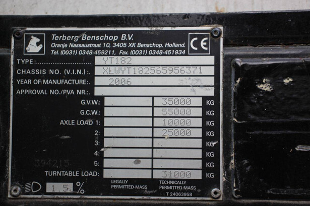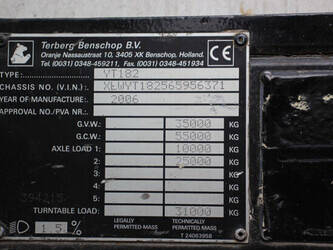 Brand: Terberg Type: YT182 Serial number: XLWYT182565956371 Year of construction: 2006 Fuel: Diesel Capacity: 31000 kg Operating hours: 33355 h Machine weight: 35,000 kg Tires: Pneumatic tires Color: black