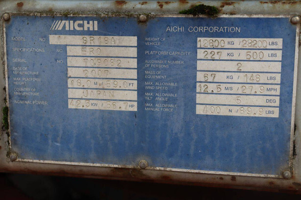 Brand: Aichi Type: SR18A Serial number: 709082 Year of construction: 2007 Fuel: Diesel Lifting capacity: 227 kg Working height: 20.0 m Operating hours read: 7594 h Machine weight: 12800 kg Running gear: Tracks Type: Telescopic boom lift Color: gray