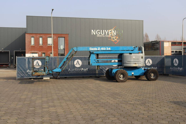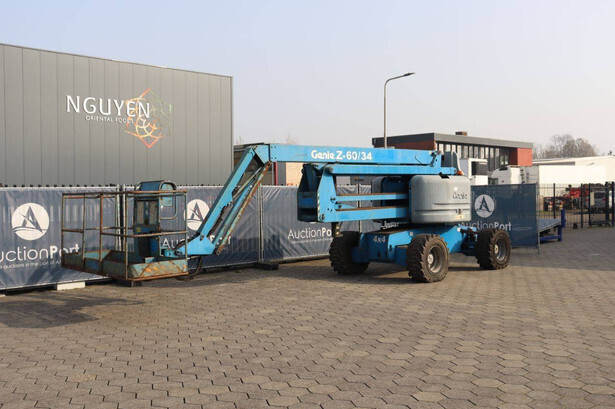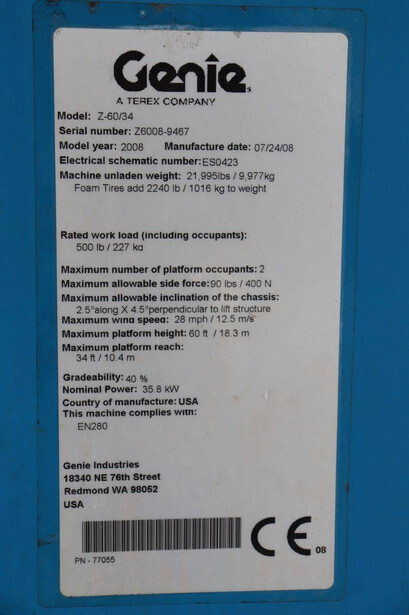 Brand: Genie Type: Z-60/34 Serial number: Z6008-9467 Year of construction: 2008 Fuel: Diesel Lifting capacity: 227 kg Working height: 20.39 m Operating hours read: 4620 h Machine weight: 9977 kg Chassis: Wheels Type: Articulated boom lift Tires: Pneumatic tires Color: blue
