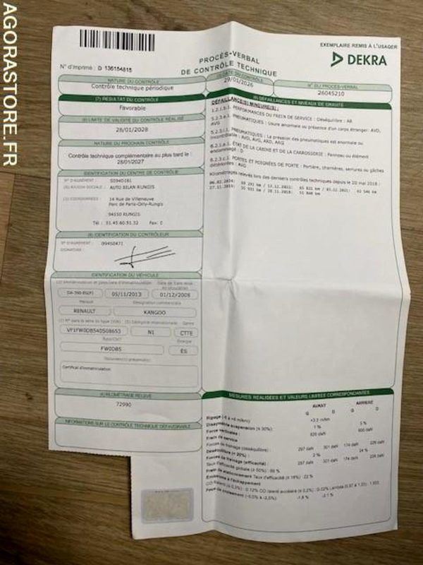 Renault KANGOO Power: 106 Engine volume: 1598 Fuel: petrol Axle 1 common tyre size: 195/65 R15 Gearbox type: manual FR: Type de véhicule FOURGONNETTE Dimensions (Longueur, Largeur, Hauteur): largeur : 183 longueur : 421 Nb portes: 4 Etat carrosserie: MOYEN Etat intérieur: BON Etat des pneus: MOYEN Transmission: AVANT Version: GD 1.6 Crit'air: 2 Véhicule roulant Etat du moteur => tournant Défaut de carrosserie => voir photos Petite fuite au niveau de la cabine coté conducteur en cas de force averses Double de clé // Neuf Contrôle technique réscent janvier 2026 Ref No:413384 VIN: VF1FW0DB540508653