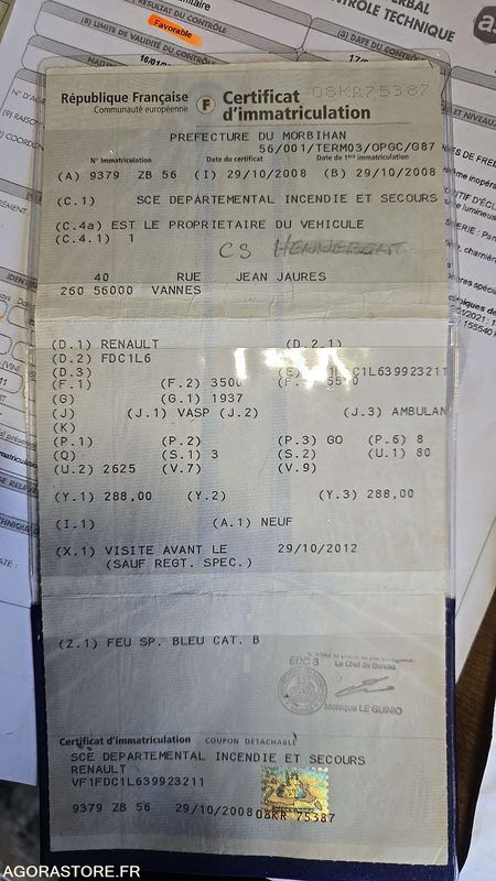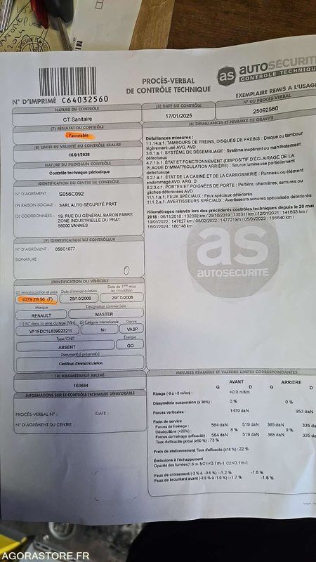 Renault MASTER Power: 120 Engine volume: 2464 Fuel: diesel Axle 1 common tyre size: 225/65r16 112 110r Gearbox type: manual FR: Type de véhicule FOURGON Dimensions (Longueur, Largeur, Hauteur): largeur : 199 longueur : 590 Etat carrosserie: Globalement bon quelques traces de frottement Etat intérieur: Et un moyen, trace de pièces démontées Etat des pneus: 10% d usure avant neuf a l arrière Transmission: AVANT Etat soubassements: Non verifiable Véhicule non roulant Moteur non tournant Un rapport d'inventaire est fourni dans la rubrique « documents » Ref No:411237 VIN: VF1FDC1L639923211