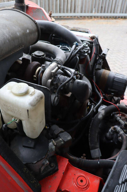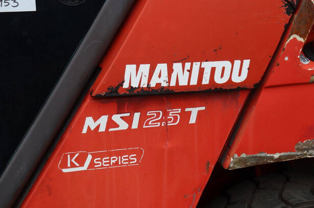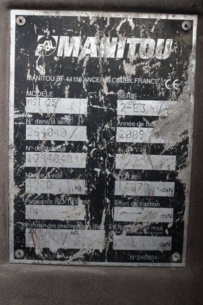 Brand: Manitou Type: MSI25 Serial number: 1264040 Year of construction: 2009 Fuel: Diesel Mast type: Duplex Sideshift: Yes Lifting capacity: 2500 kg Lifting height: 3700 mm Operating hours read: 5265 h Machine weight: 4070 kg Tires: Solid tires Color: red