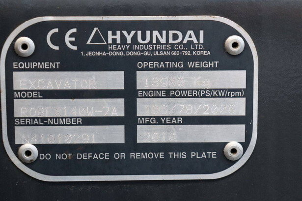 Brand: Hyundai Type: ROBEX 140W-7A Serial number: N41010291 Year of construction: 2010 Fuel: Diesel Engine power: 78.0 kW Quick change: Yes Operating hours read: 5508 h Machine weight: 13900 kg Chassis: Wheels Color: yellow