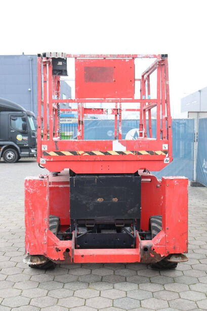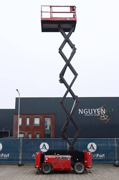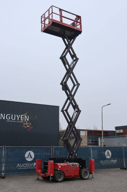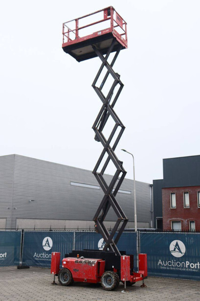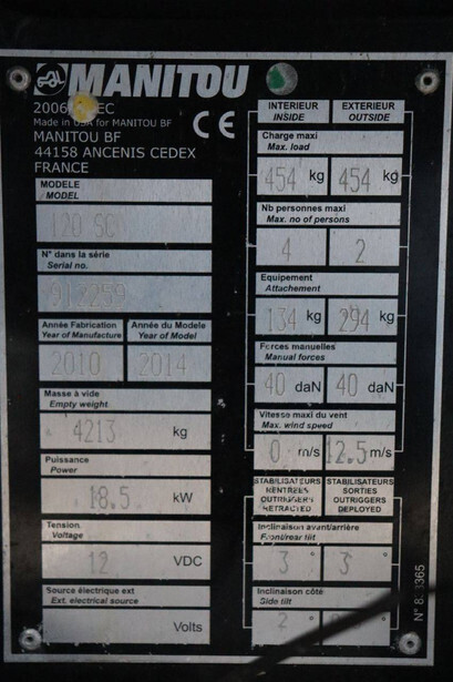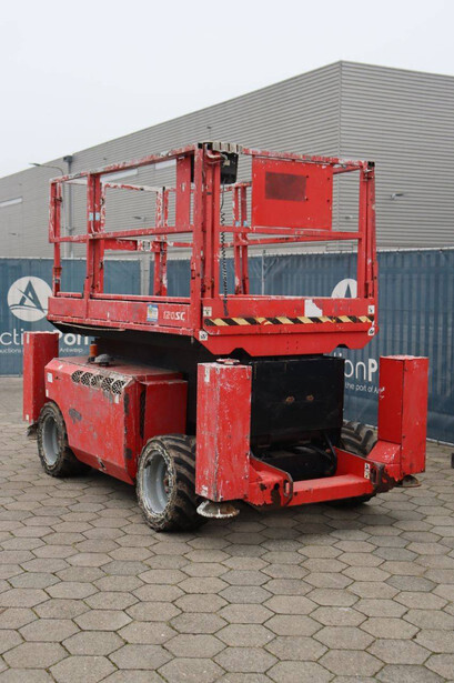 Brand: Manitou Type: 120 SC Serial number: 912259 Year of construction: 2010 Fuel: Diesel Lifting capacity: 454 kg Working height: 12 m Operating hours read: 1672 h Machine weight: 4213 kg Chassis: Wheels Type: Scissor lift Tires: Pneumatic tires Color: red