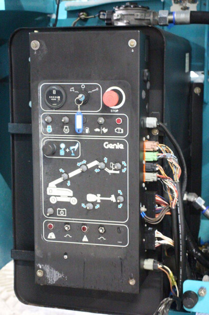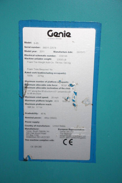 Brand: Genie Type: S-65 Serial number: S6011-22578 Year of construction: 2011 Fuel: Diesel Lifting capacity: 227 kg Working height: 21.8 m Reading operating hours: 8830 h Machine weight: 10267 kg Chassis: Wheels Type: Telescopic boom lift Tires: Pneumatic tires Color: blue