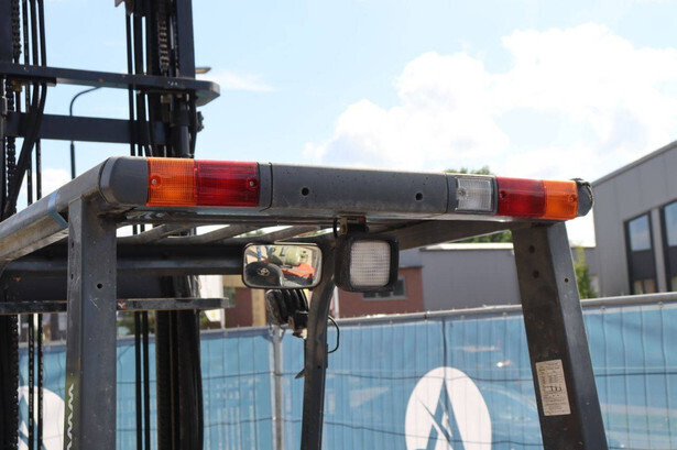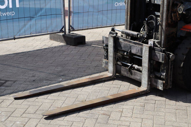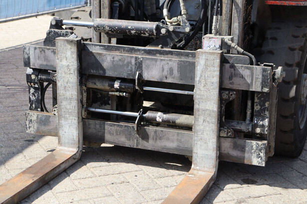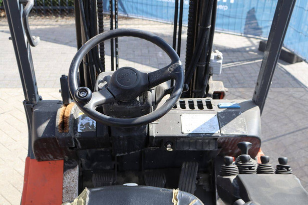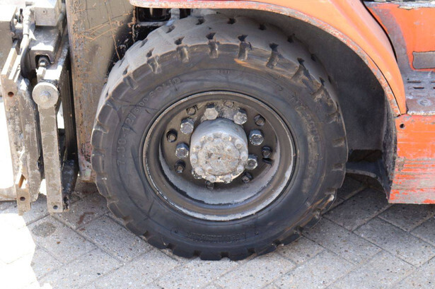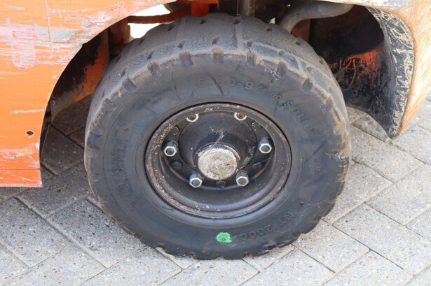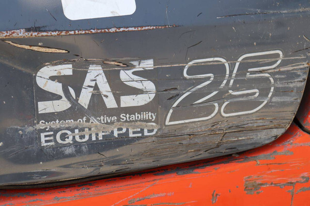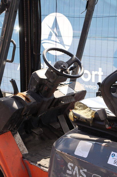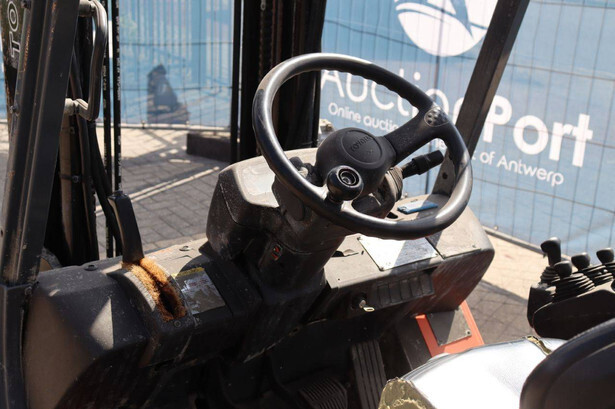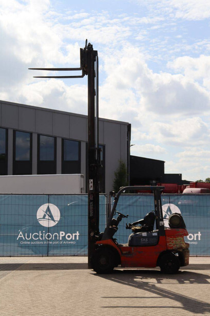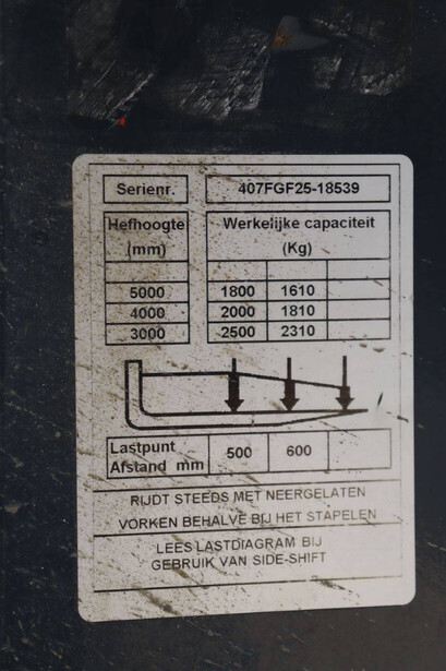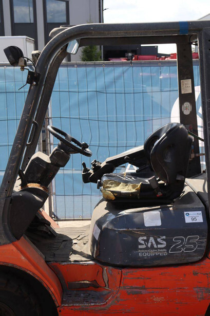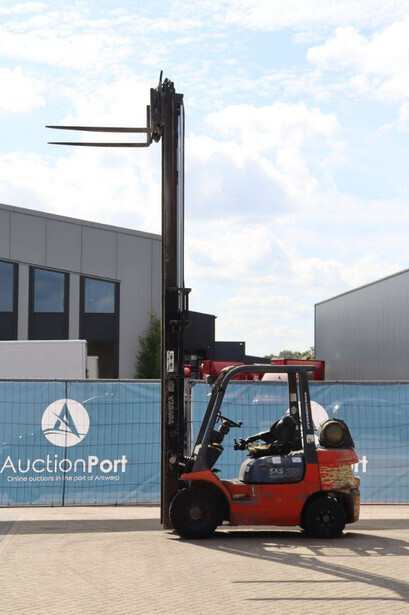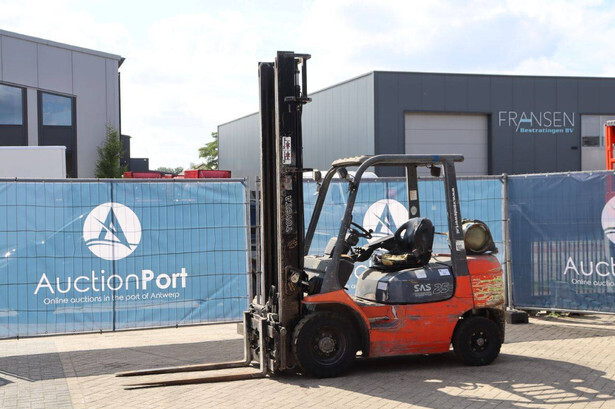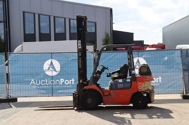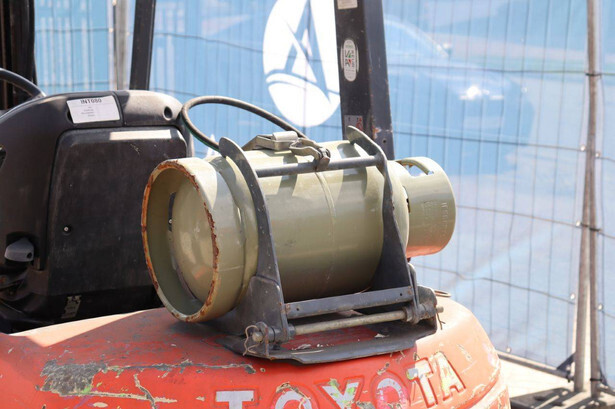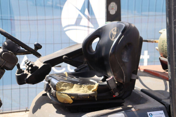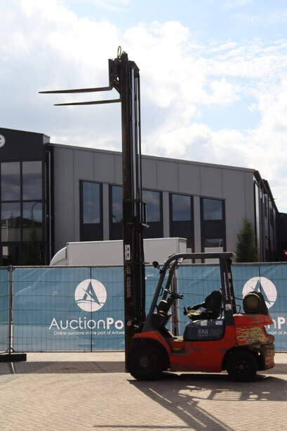 Brand: Toyota Type: SAS 25 Serial number: 407FGF25-18539 Year of construction: 2011 Fuel: LPG Mast type: Not known Sideshift: Yes Lifting capacity: 2500 kg Lifting height: 3000 mm Operating hours read: Not known Machine weight: 4120 kg Tires: Solid tires Color: red Machine description: Machine starts, drives, lifts and lowers.