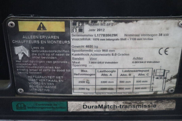 Brand: Hyster Type: H2.5FT Serial number: L177B35629K Year of construction: 2012 Fuel: LPG Mast type: Duplex Sideshift: Yes Lifting capacity: 2500 kg Lifting height: 3300 mm Operating hours read: 3219 h Machine weight: 4020 kg Tires: Solid tires Color: red