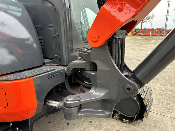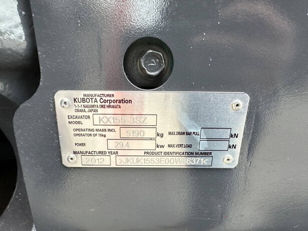 Brand: Kubota Type: KX155-3SZ Serial number: JKUK1553E00W86371 Year of construction: 2012 Fuel: Diesel Engine power: 39 HP Engine brand: Kubota V2203 Number of cylinders: 4 Quick change: No Operating hours read: 3356 h Machine weight: 5115 kg Running gear: Tracks Track width: 400 mm Color: orange Transport dimensions: 5500 x 2100 x 2500 mm Tray width: 650 mm
