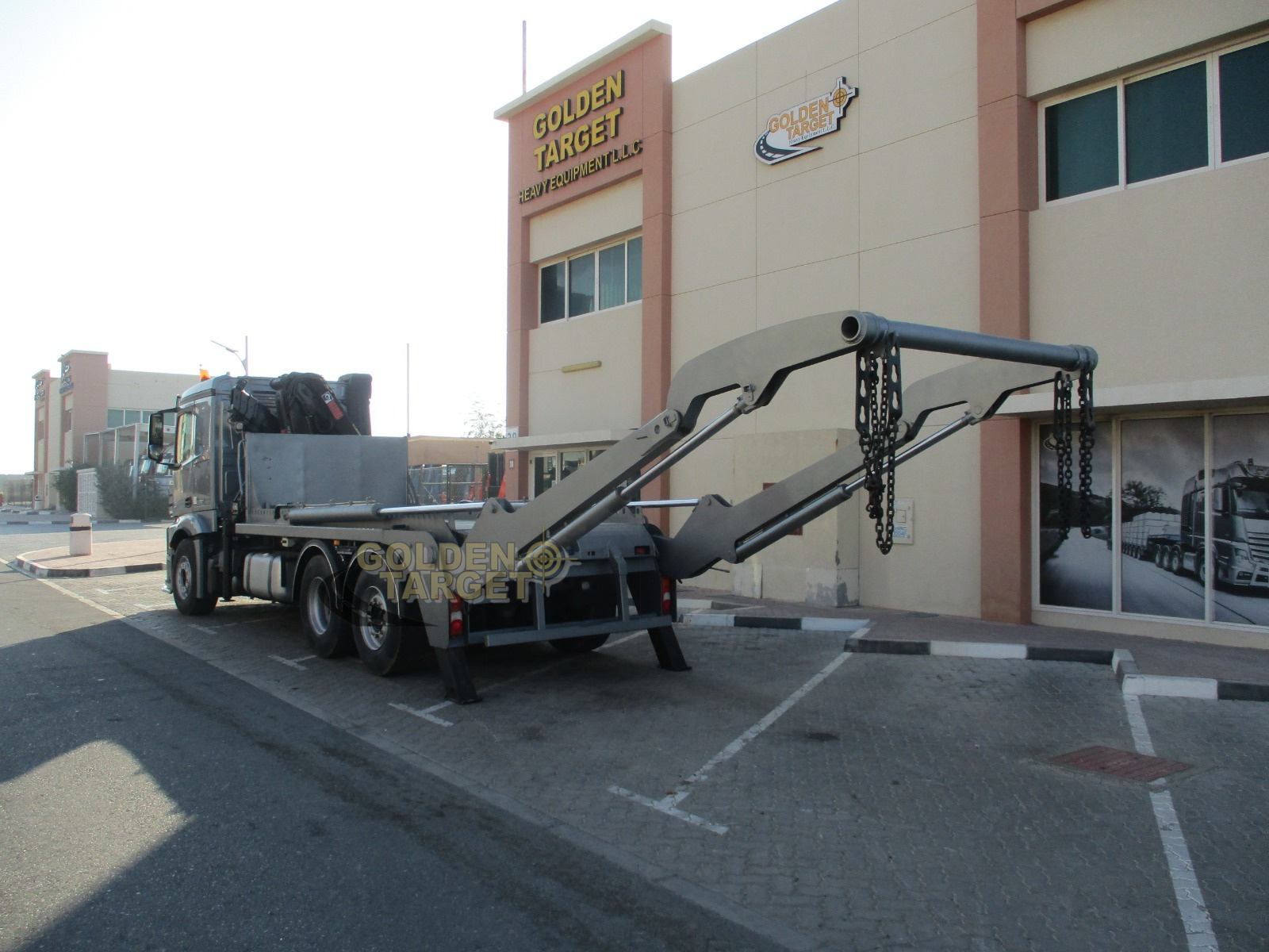 Mercedes Actros 2642 6×2 Double Skip Loader with HIAB Crane 2012 The Mercedes Actros 2642 from 2012 is a robust skip loader equipped with a HIAB 099-HIDUO crane, designed for efficient handling and transport tasks. This used model features a reliable 6-cylinder diesel engine delivering 420 horsepower, ensuring powerful performance for demanding operations. The truck employs a 6x2 configuration, with a left-hand drive, that offers stability and maneuverability for various loads. This vehicle is outfitted with an automatic transmission for smooth and effortless gear changes, enhancing driver comfort and operational efficiency. The suspension system consists of a front spring and rear air setup, providing a balanced ride whether loaded or unloaded. Having traveled 781,286 kilometers, it demonstrates durability, maintained performance, and reliability in the field. Ideal for businesses requiring heavy-duty lifting and transport capabilities, this Mercedes skip loader combines strength and precision. Its combination of features and specifications makes it a versatile choice for companies needing an all-in-one solution for their skip handling needs. Body Type: Skip Loader Engine: 6 cylinder Horsepower: 420 Fuel type: Diesel Transmission: Automatic Configuration: 6x2 Drive: LHD