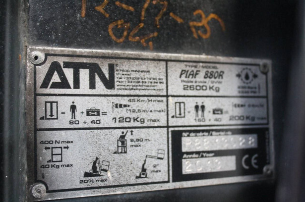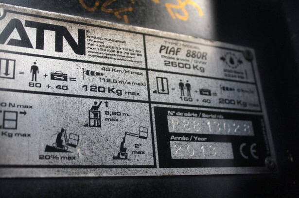 Brand: ATN Type: PIAF 880R Serial number: P8813028 Year of construction: 2013 Fuel: Electric Lifting capacity: 200 kg Working height: 8.8 m Reading operating hours: 930 h Machine weight: 2600 kg Chassis: Wheels Type: Mast lift Tires: Solid tires Color: blue