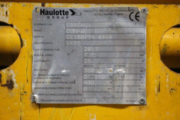 Brand: Haulotte Type: Compact 8 Serial number: CE150794 Year of construction: 2013 Fuel: Electric Lifting capacity: 350 kg Working height: 8 m Reading operating hours: 20 h Machine weight: 1655 kg Chassis: Wheels Type: Scissor lift Tires: Non-marking tires Color: yellow
