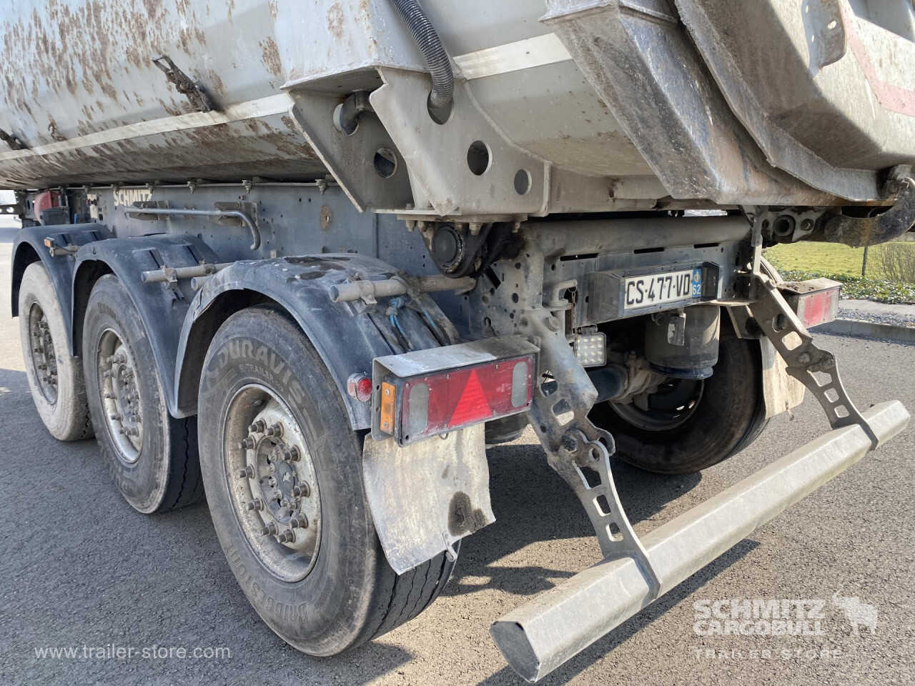 **Safety**\\Rear underrun, Antilock Braking System ABS\\\\**Exterior**\\Air suspension, 1x15 and 2x7 pin plug, Antispray\\\\**Brake system**\\Disc brake, Schmitz ROTOS\\\\**Loading area**\\Length 7.480 mm, Width 2.354 mm, Height 2.985 mm, Volume 24 m³\\\\**Tyre sizes**\\ 385/65 R22.5 , 385/65 R22.5 , 385/65 R22.5\\\\**Other dimensions and weights**\\Payload: 30.962 kg, GVW: 38.000 kg\\\\----Disques de frein Essieu 1 reste 38mm Plaquettes usure 10%Disques de frein Essieu 2 reste 33mm Plaquettes usure 30%Disques de frein Essieu 3 reste 34mm Plaquettes usure 30%Mines : 03/2027 -