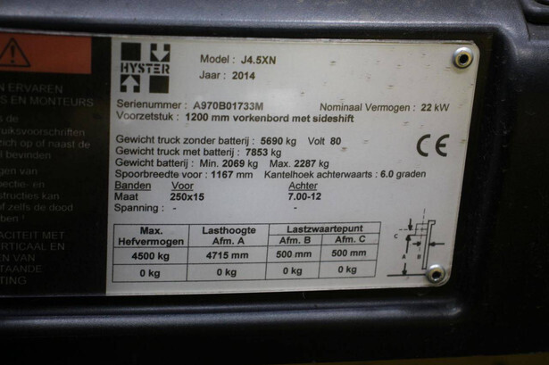 Brand: Hyster Type: J4.5XN Serial number: A970B01733M Year of construction: 2014 Fuel: Electric Mast type: Triplex Sideshift: Yes Lifting capacity: 4500 kg Lifting height: 4715 mm Operating hours read: 10680 h Machine weight: 7853 kg Tires: Solid tires Color: yellow