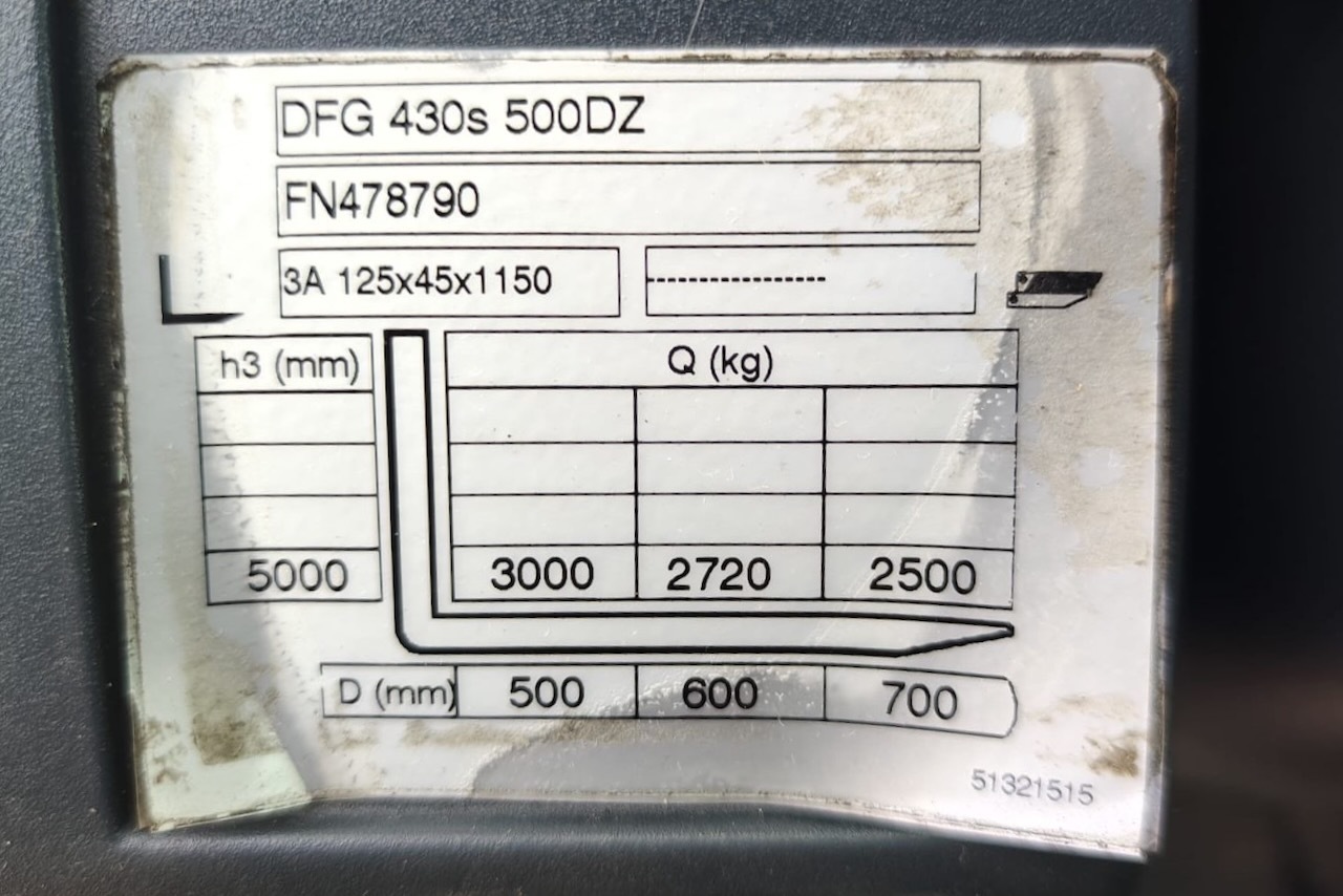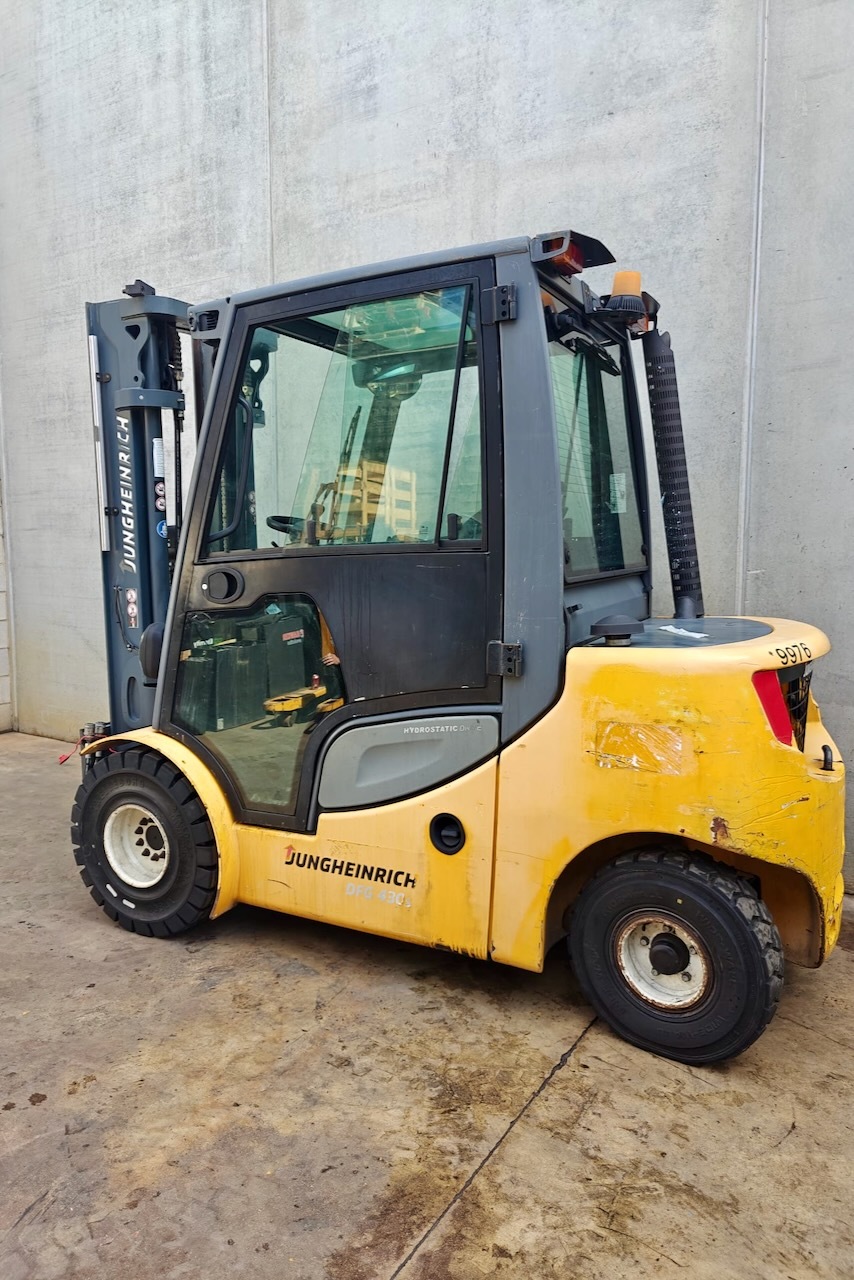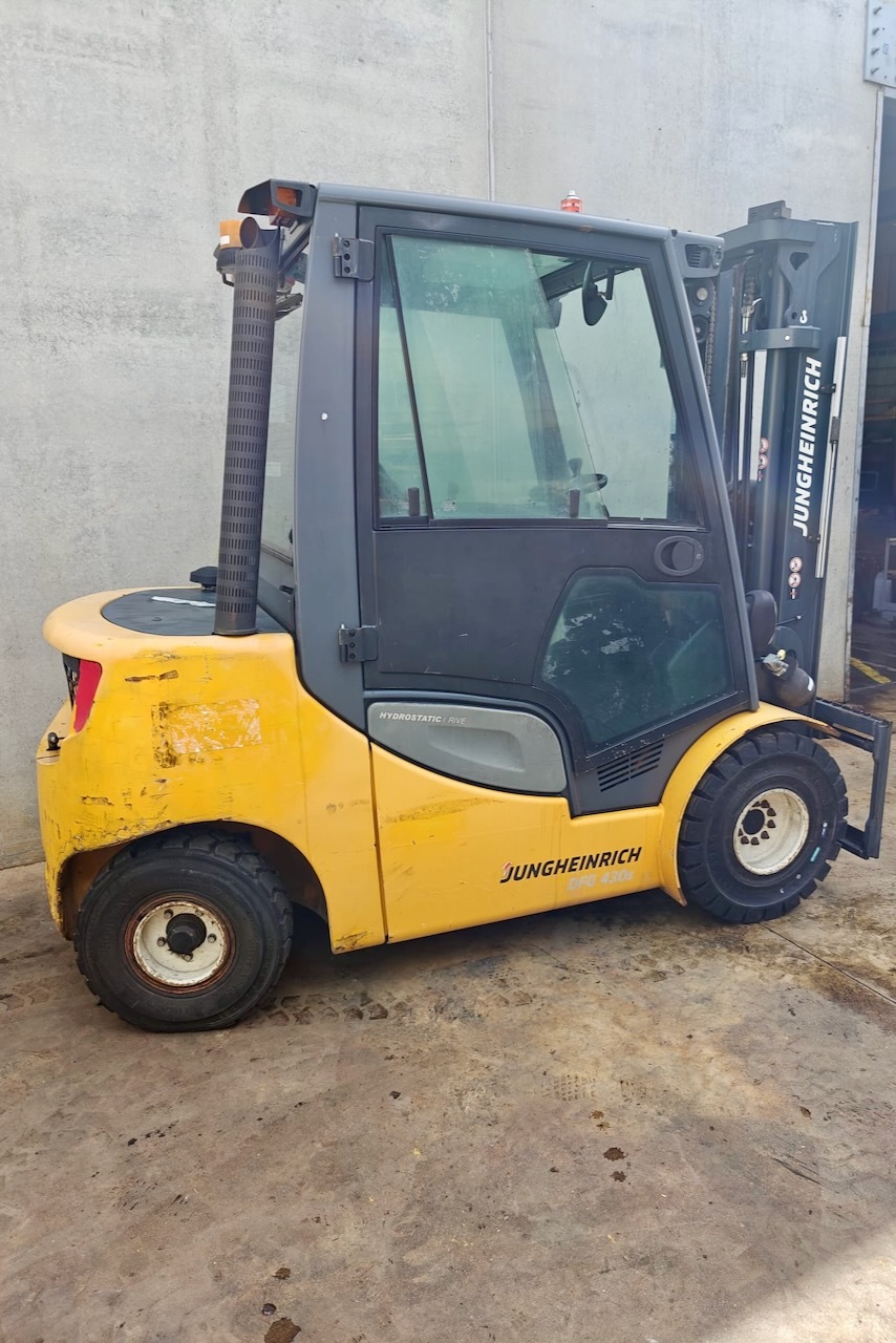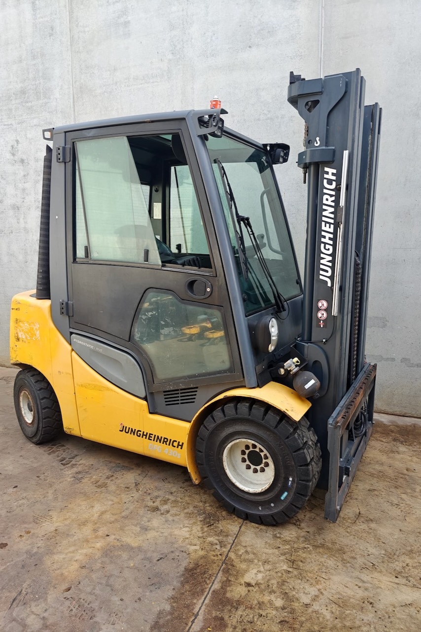 Jungheinrich DFG 430s 500 DZ Load capacity: 3.000 Kg Lifting height: 5.000 mm Mast: Triplex Fork: 0 mm Build height: 2.290 mm Motorization: Diesel Battery: Charger: No charger included Good condition, Integrated side shift, 4 valve, Complete cabin.
