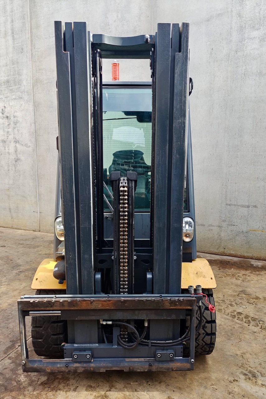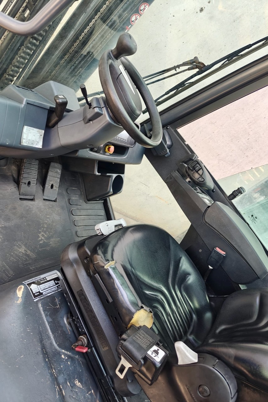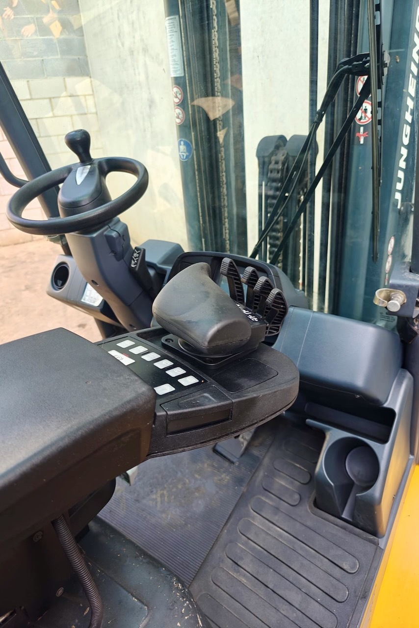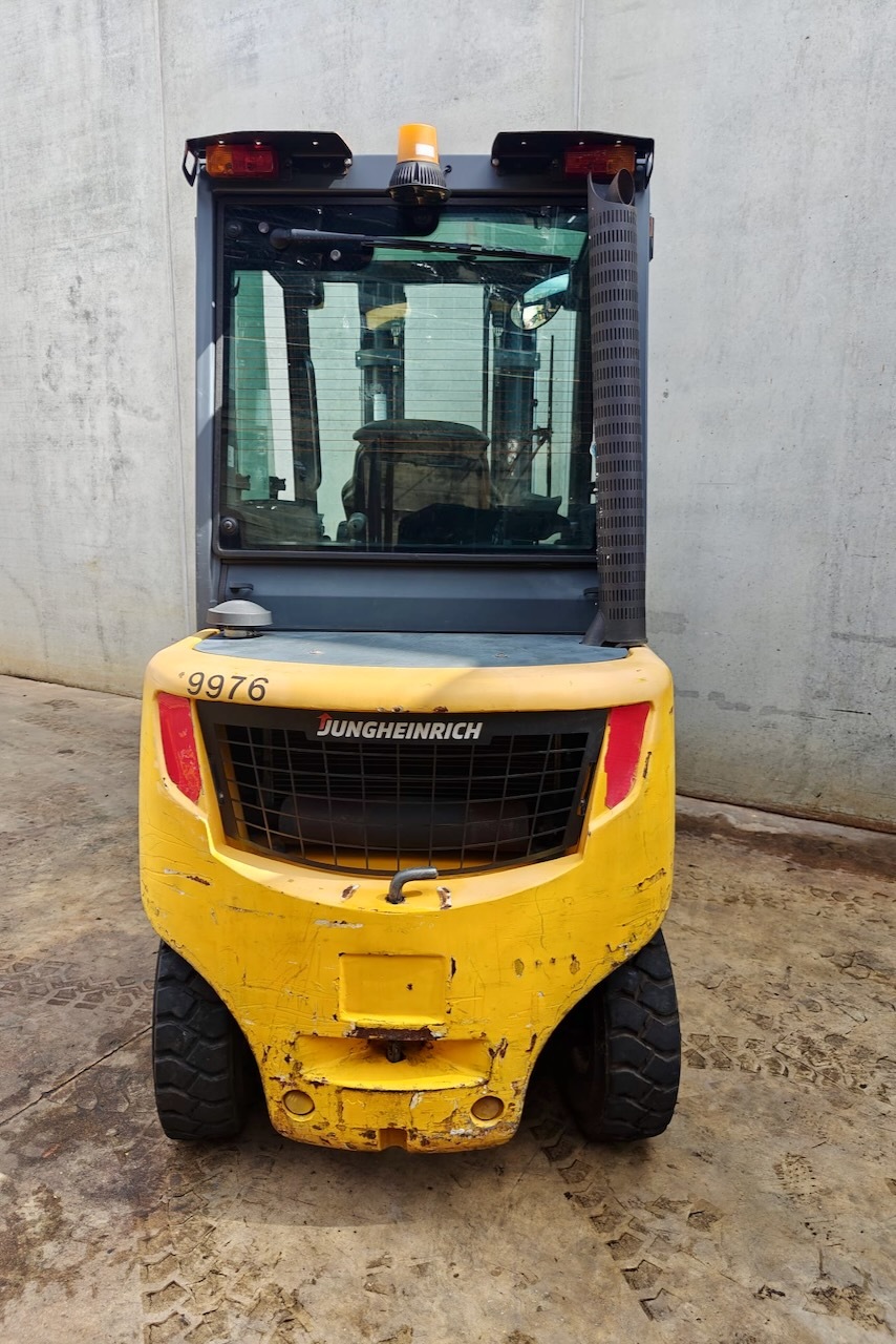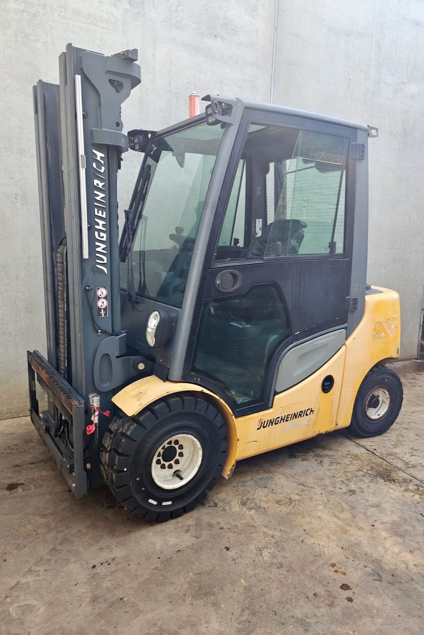 Jungheinrich DFG 430s 500 DZ Load capacity: 3.000 Kg Lifting height: 5.000 mm Mast: Triplex Fork: 0 mm Build height: 2.290 mm Motorization: Diesel Battery: Charger: No charger included Good condition, Integrated side shift, 4 valve, Complete cabin.