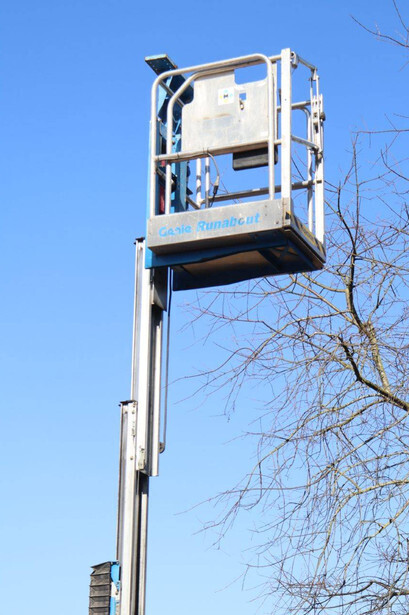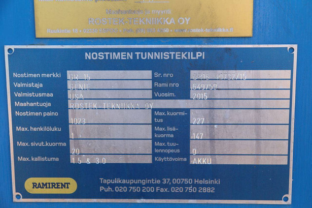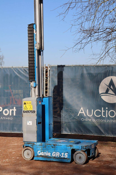 Brand: Genie Type: GR-15 Serial number: GR1640732 Year of construction: 2015 Fuel: Electric Lifting capacity: 227 kg Working height: 6.5 m Operating hours read: 234 h Machine weight: 1023 kg Chassis: Wheels Type: Mast lift Tires: Non-marking tires Color: blue