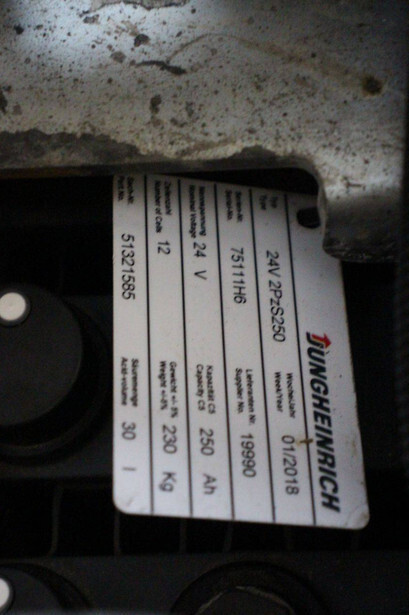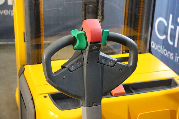 Brand: Jungheinrich Type: EJC 216 Serial number: 90438413 Year of construction: 2015 Fuel: Electric Mast type: Duplex Lifting capacity: 1600 kg Lifting height: 5250 mm Drive-through height: 2250 mm Reading operating hours: 1843 h Machine weight: 1287 kg Color: yellow