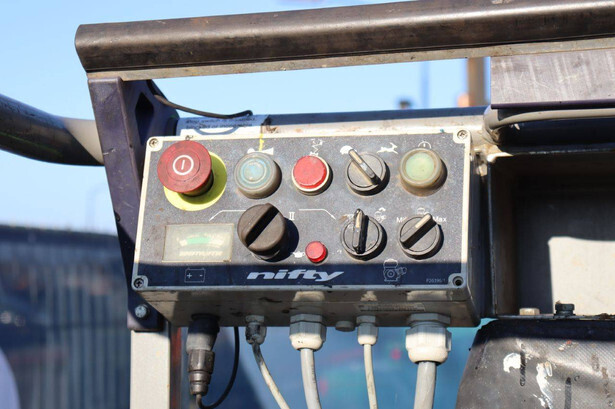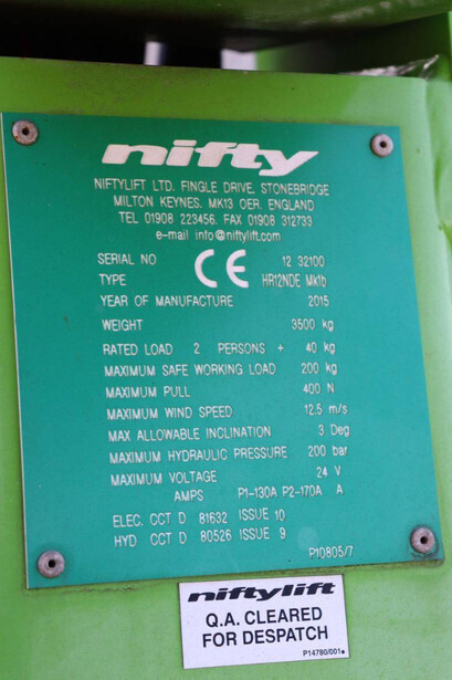 Brand: Niftylift Type: HR12NDE Year of construction: 2015 Fuel: Electric + Diesel Lifting capacity: 200 kg Working height: 12 m Operating hours read: Not known Chassis: Wheels Type: Articulated boom lift Color: green