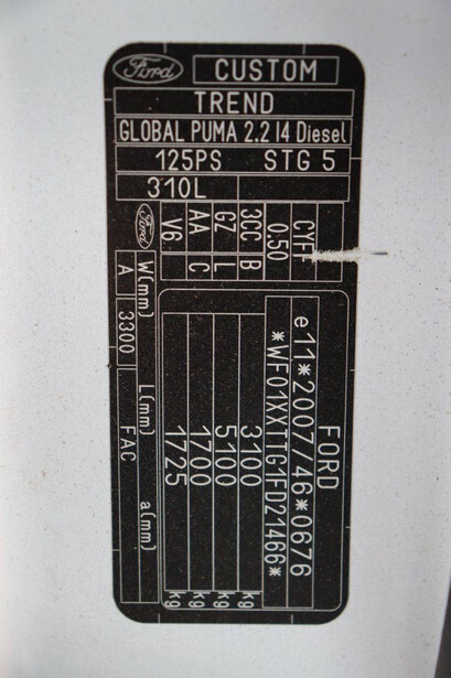 Brand: Ford Model: TRANSIT CUSTOM Chassis number: WF01XXTTG1FD21466 Date of first registration: 2016 Fuel: Diesel Engine power: 125.0 HP Transmission: Manual Cylinder capacity: 2198 cc Mileage reading: 263974 KM Color: white