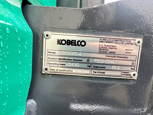 Brand: Kobelco Type: SK55SRX-6 Serial number: PS03-05467 Year of construction: 2016 Fuel: Diesel Engine power: 29.6 kW Engine make and type: Yanmar 4TNV88