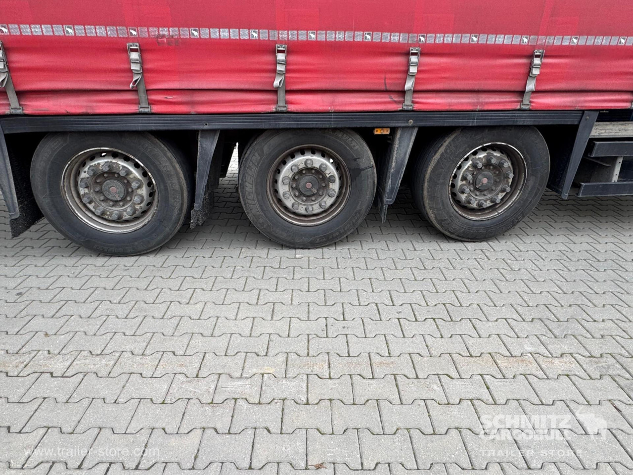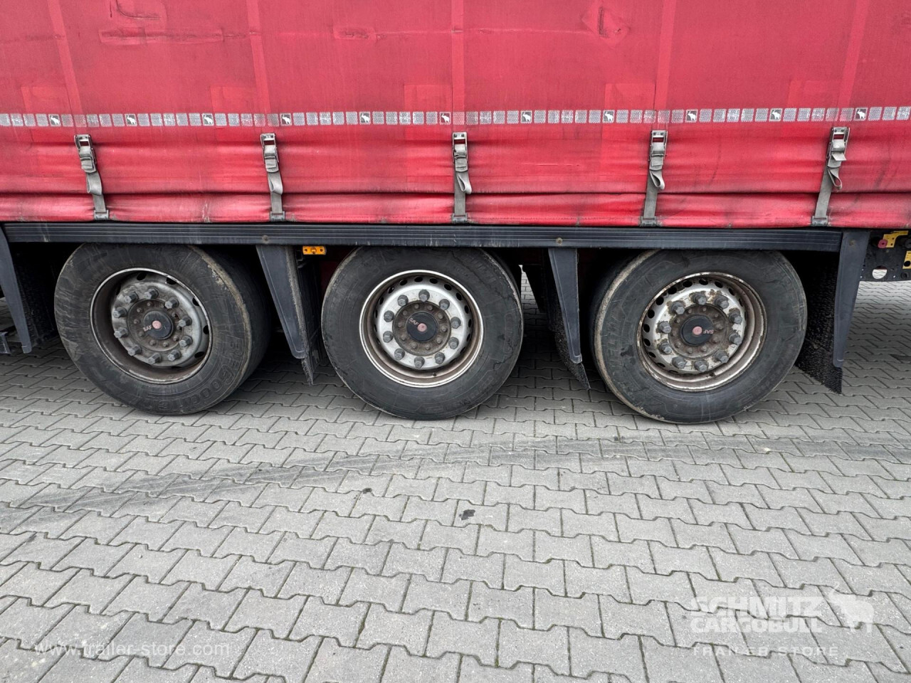 **Safety**\\Rear underrun, Antilock Braking System ABS\\\\**Exterior**\\Air suspension, 1x15 and 2x7 pin plug, Antispray\\\\**Cargo securing**\\DIN EN 12642 (code XL) certificate\\\\**Brake system**\\Disc brake, SAF\\\\**Floor**\\Wisadeck floor\\\\**Loading area**\\Length 13.620 mm, Width 2.480 mm, Height 2.900 mm, Volume 97 m³\\\\**Tyre sizes**\\1. Achse: 385/55 R22.5 , Tread depth: 4.5 mm / 5 mm, 2. Achse: 385/55 R22.5 , Tread depth: 8 mm / 9 mm, 3. Achse: 385/55 R22.5 , Tread depth: 6 mm / 7.4 mm\\\\**Other dimensions and weights**\\Wheel base: 7.700 mm\\\\----