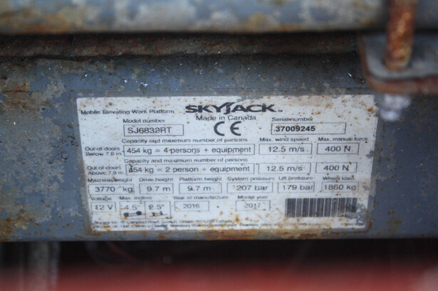 Brand: Skyjack Type: SJ6832RT Serial number: 37009245 Year of construction: 2016 Fuel: Diesel Engine: Kubota Lifting capacity: 454 kg Working height: 11.7 m Operating hours read: 1183 h Machine weight: 3770 kg Chassis: Wheels Type: Scissor lift Tires: Pneumatic tires Color: red