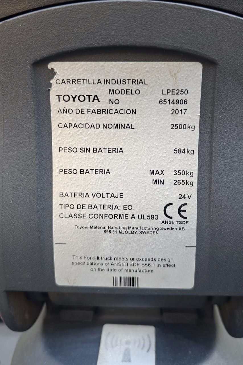 BT LPE 250 Load capacity: 2.500 Kg Lifting height: Mast: Fork: 1.150 x 550 mm Build height: Motorization: Electric Battery: 24v/400Ah Charger: 24 v Good condition, Electric steering wheel, Foldable platform.