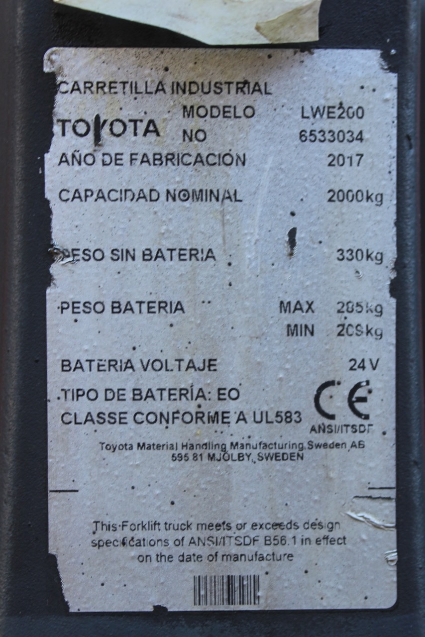 BT LWE 200 Load capacity: 2.000 Kg Lifting height: Mast: Fork: 1.150 x 520 mm Build height: Motorization: Electric Battery: 24v/260Ah Charger: 24 v Good condition.
