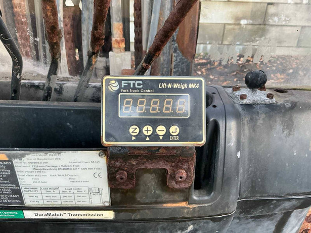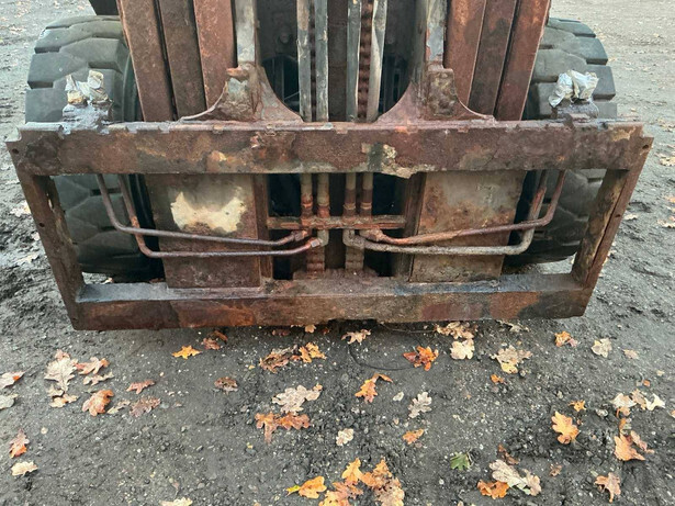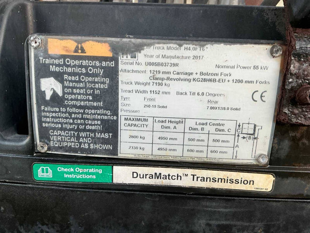 Brand: Hyster Type: H4.0F16 Serial number: U005B03739R Year of construction: 2017 Fuel: Diesel Mast type: Triplex Sideshift: No Lifting capacity: 2800 kg Lifting height: 4950 mm Operating hours read: Not known Machine weight: 7190 kg Tires: Solid tires Color: yellow