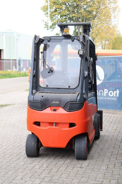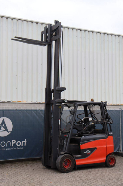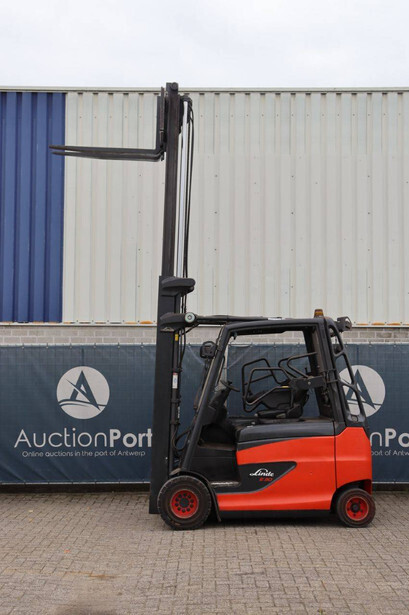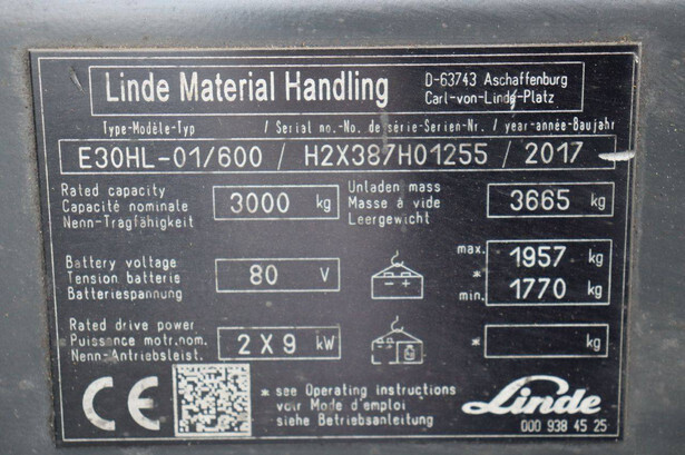 Brand: Linde Type: E30HL-01/600 Serial number: H2X387H01255 Year of construction: 2017 Fuel: Electric Mast type: Duplex Sideshift: No Lifting capacity: 3000 kg Operating hours read: 12742 h Machine weight: 3665 kg Tires: Solid tires Color: red