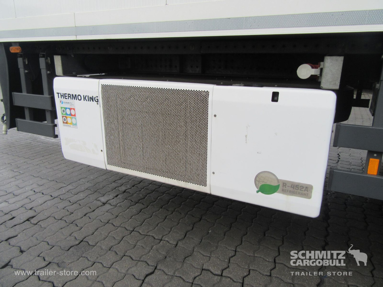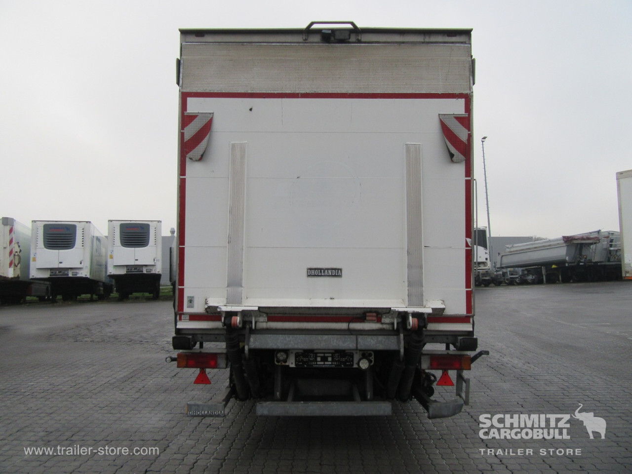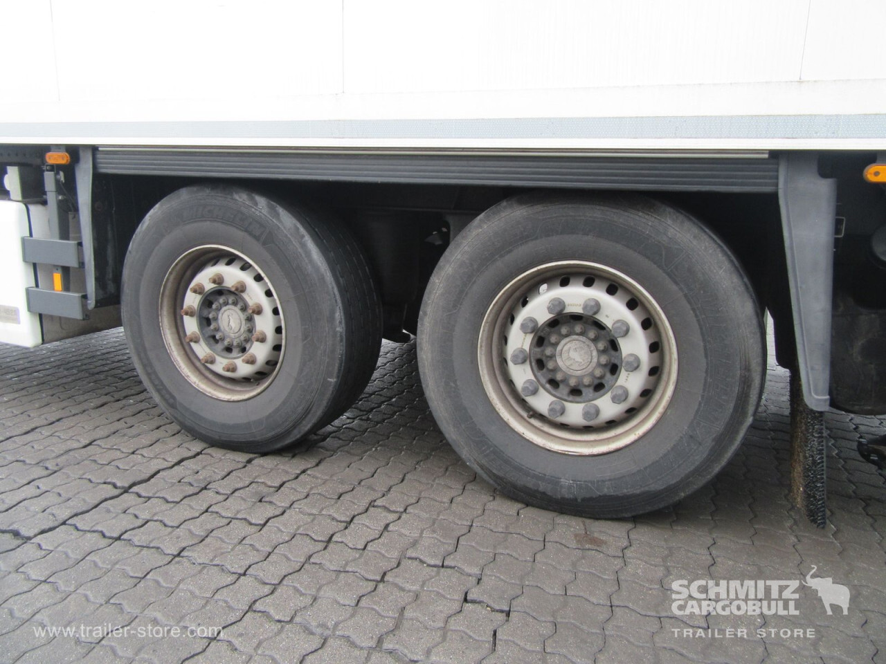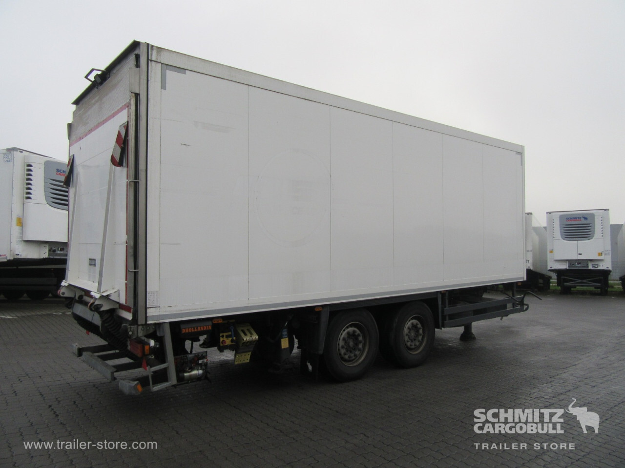 Remarks: **Safety**\\Rear underrun, Antilock Braking System ABS, Hubodometer\\\\**Exterior**\\Air suspension, Taillift: Dhollandia, 2000 kg, Spare wheel carrier, Bolted chassis, 1x15 and 2x7 pin plug, Antispray\\\\**Further equipment**\\Unterflurkühlgerät in Fahrtrichtung links / Batteriekasten mit 2 Batterien 12V / 230 AhAusführung mit Längs-Trennwand 1/3-Kammer in Fahrtrichtung rechtsISO-Längstrennwand, FP38 Breite 1/3 Kammer - 824mm,2/3 Kammer -\\\\**Brake system**\\Disc brake, Schmitz ROTOS\\\\**Floor**\\Floor rails\\\\**Wand**\\Stirnwand verstärkt\\\\**Wall**\\Frontwall recess for cooling, Wall thickness45 mm\\\\**Cooling unit**\\Thermoking Spectrum, Diesel/Elektro, 5.009 Operating hours Diesel, 334 Operating hours electric\\\\**Loading area**\\Length 7.450 mm, Width 2.490 mm, Height 2.450 mm, Volume 45 m³\\\\**Tyre sizes**\\1. Achse: 385/65 R22.5 , Tread depth: 8 mm / 9 mm, 2. Achse: 385/65 R22.5 , Tread depth: 5 mm / 8 mm\\\\**Other dimensions and weights**\\Payload: 11.887 kg, GVW: 18.000 kg\\\\----
