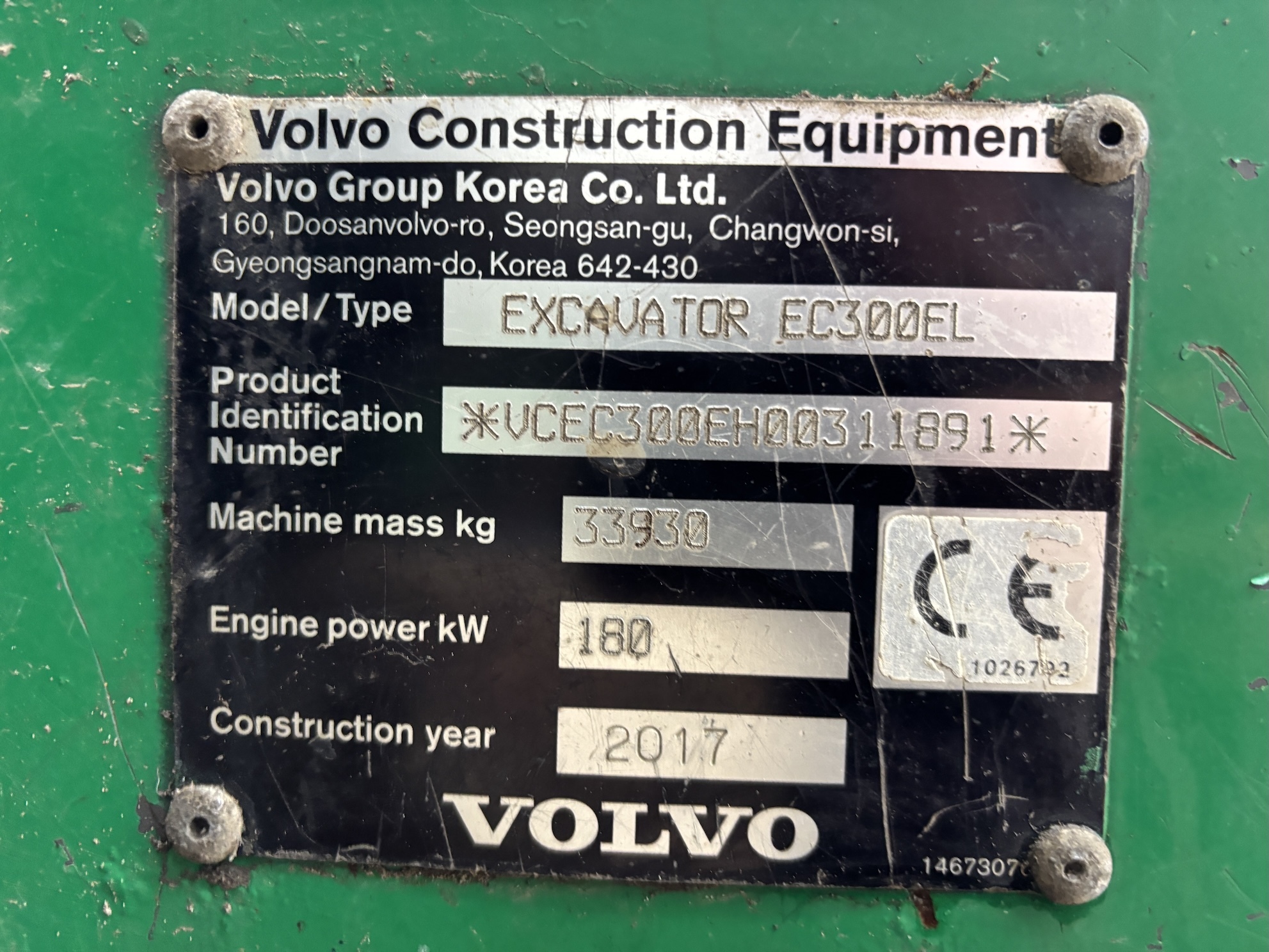 Volvo EC300EL Weight 33930 This Volvo EC300EL is equipped with a 6 cilinder water cooled turbo charged Volvo D8J (180kW) diesel engine with 13199 working hours on the service meter. Excellent bucket with CW hydraulic quick coupler, hydraulics for hammer and rotation function, central lubrication, all books and papers included, read and side view camera, airco, radio, additional work lights, electric diesel pump, additional cabin filter system etc..Dutch machine, dealer maintained, good undercarriage, no excessive play on pins and bushes, no faults codes, really tidy machine. For more information please contact us.