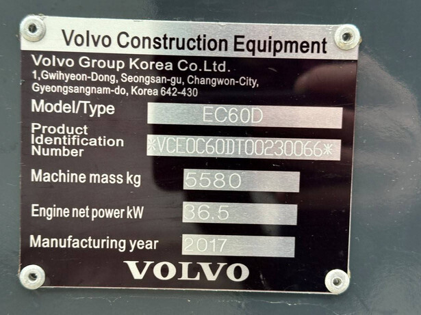 Brand: Volvo Type: EC60D Serial number: VCEEC60DT00230066 Year of construction: 2017 Fuel: Diesel Engine make and type: Volvo D2.6A-DI Engine power: 36.5 kW Cylinders: 4 Quick change: Yes Operating hours read: 3121 h Machine weight: 5580 kg Transport dimensions (LxWxH): 5900 x 1950 x 2600 mm Running gear: Tracks