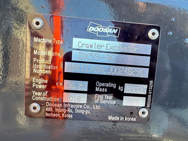 Brand: Doosan Type: DX55-9C Serial number: DXCCEABALJ0024829 Year of construction: 2018 Fuel: Diesel Engine make and type: Yanmar 4TNV94L Engine power: 36.2 kW / 50 hp Cylinders: 4 Quick change: Yes Operating hours read: 4156 h Machine weight: 5500 kg Transport dimensions (L x W x H): 5700x2000x2600 mm Running gear: Tracks