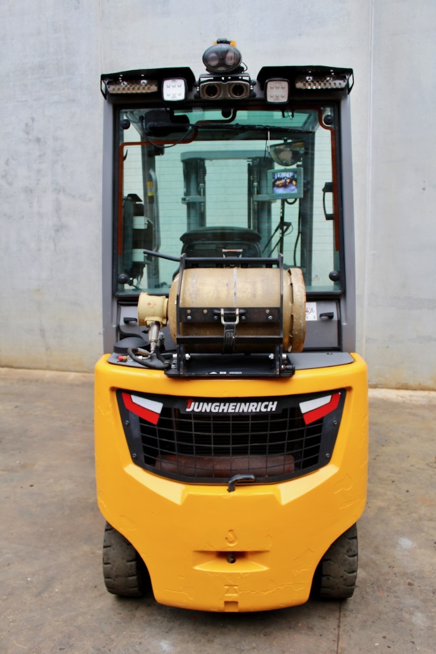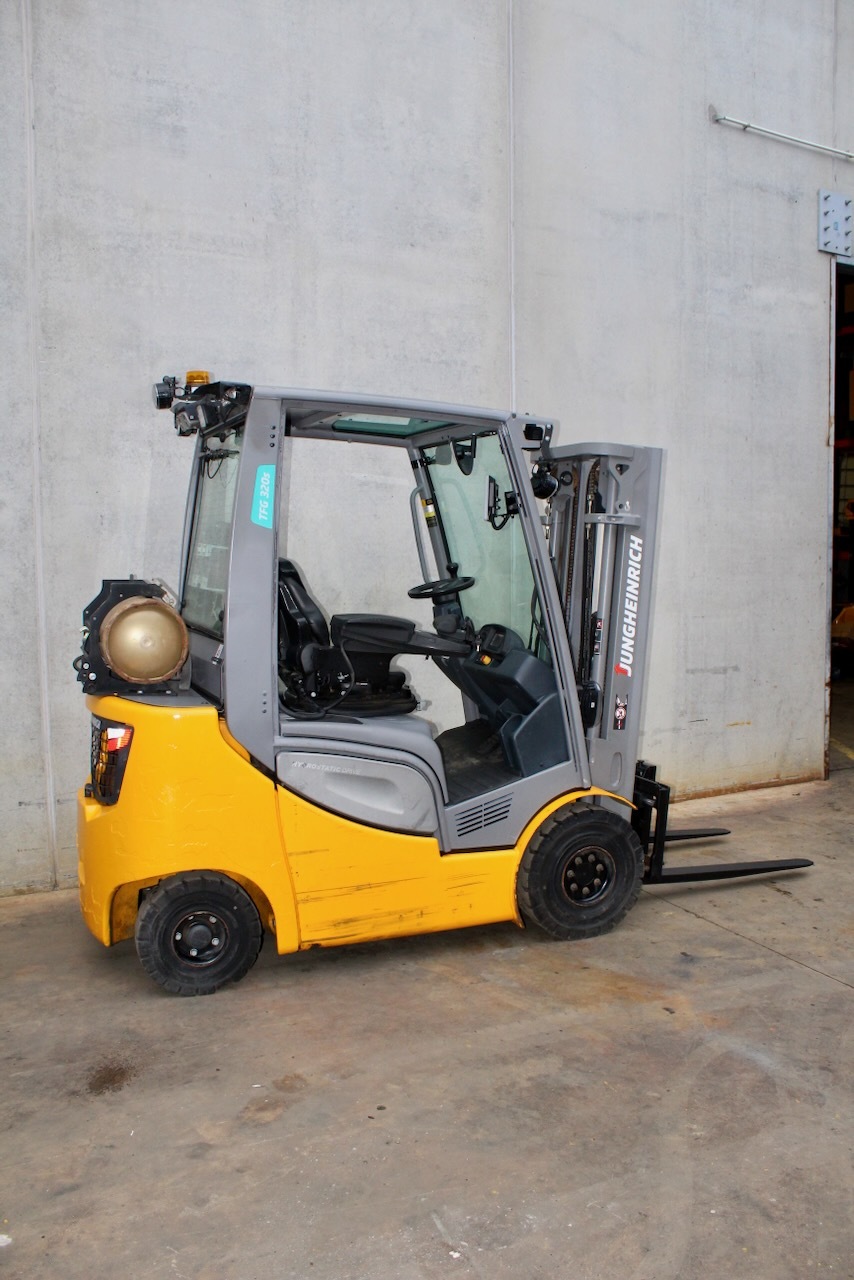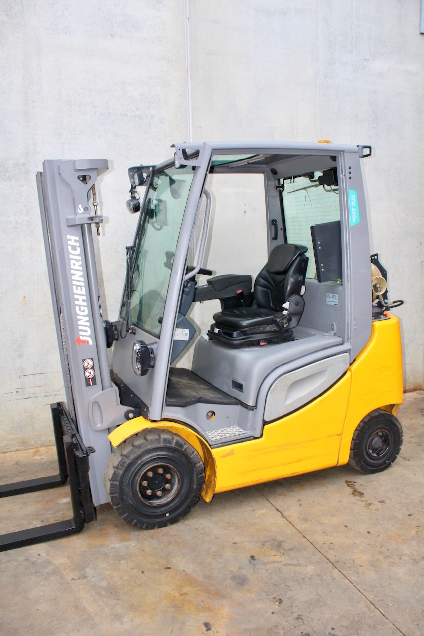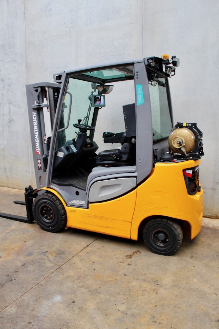 Jungheinrich TFG 320s 440 DZ Load capacity: 2.000 Kg Lifting height: 4.640 mm Mast: Triplex Fork: 1.150 mm Build height: 2.120 mm Motorization: Gas Battery: Charger: No charger included Good condition, Integrated side shift, Half-cabin, Permanent Rear-view camera. Reference number: 7426