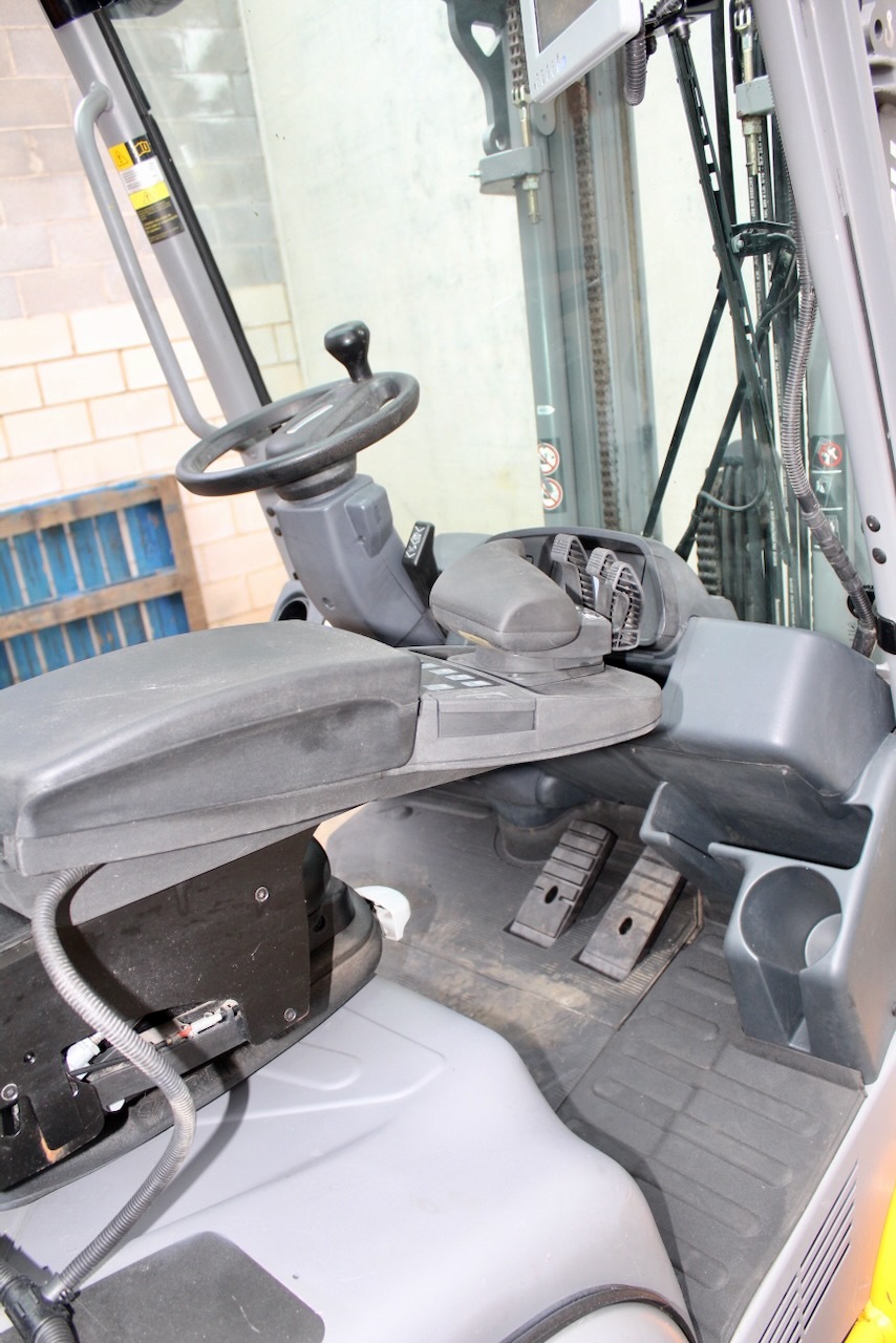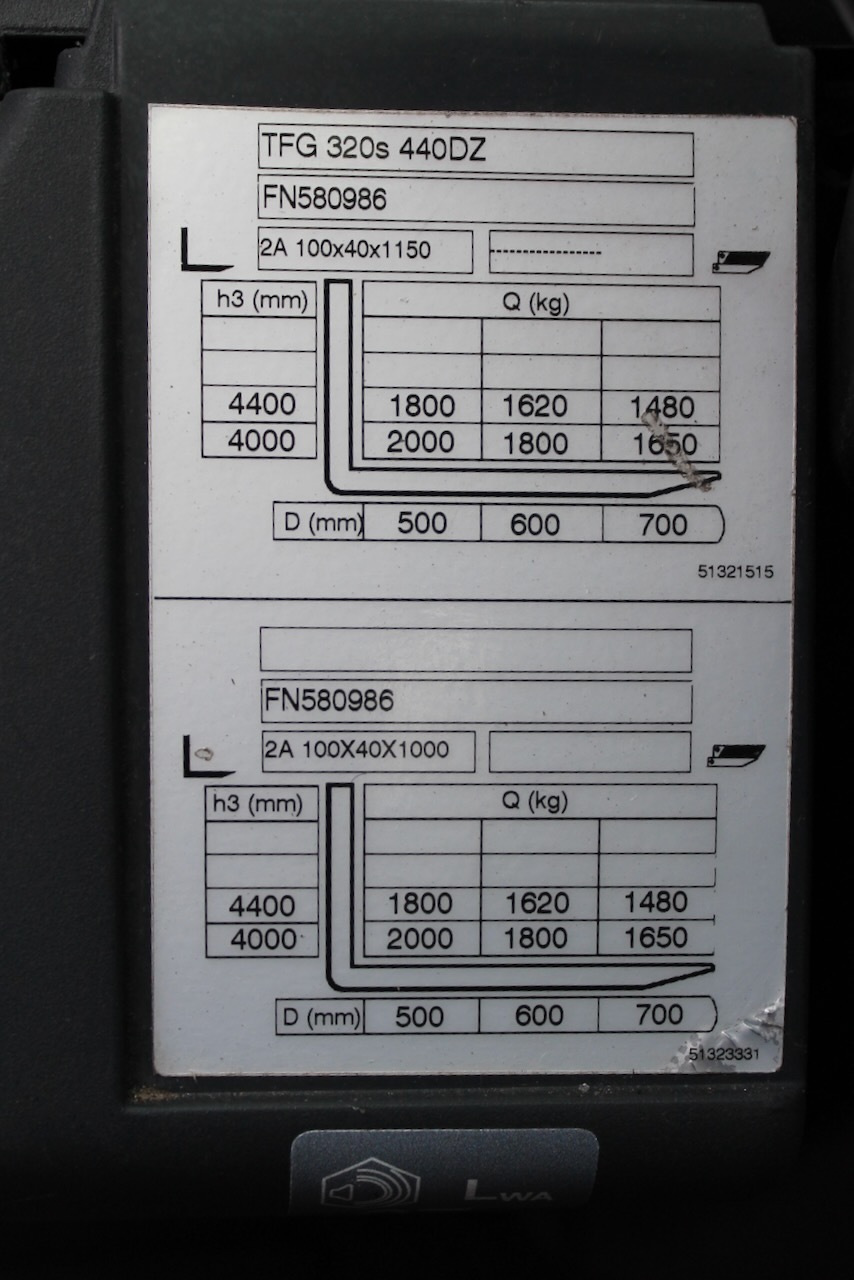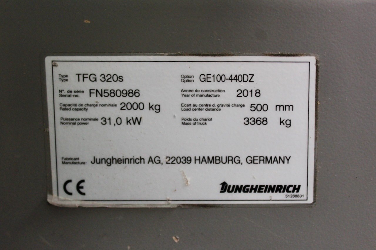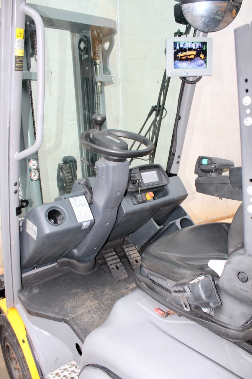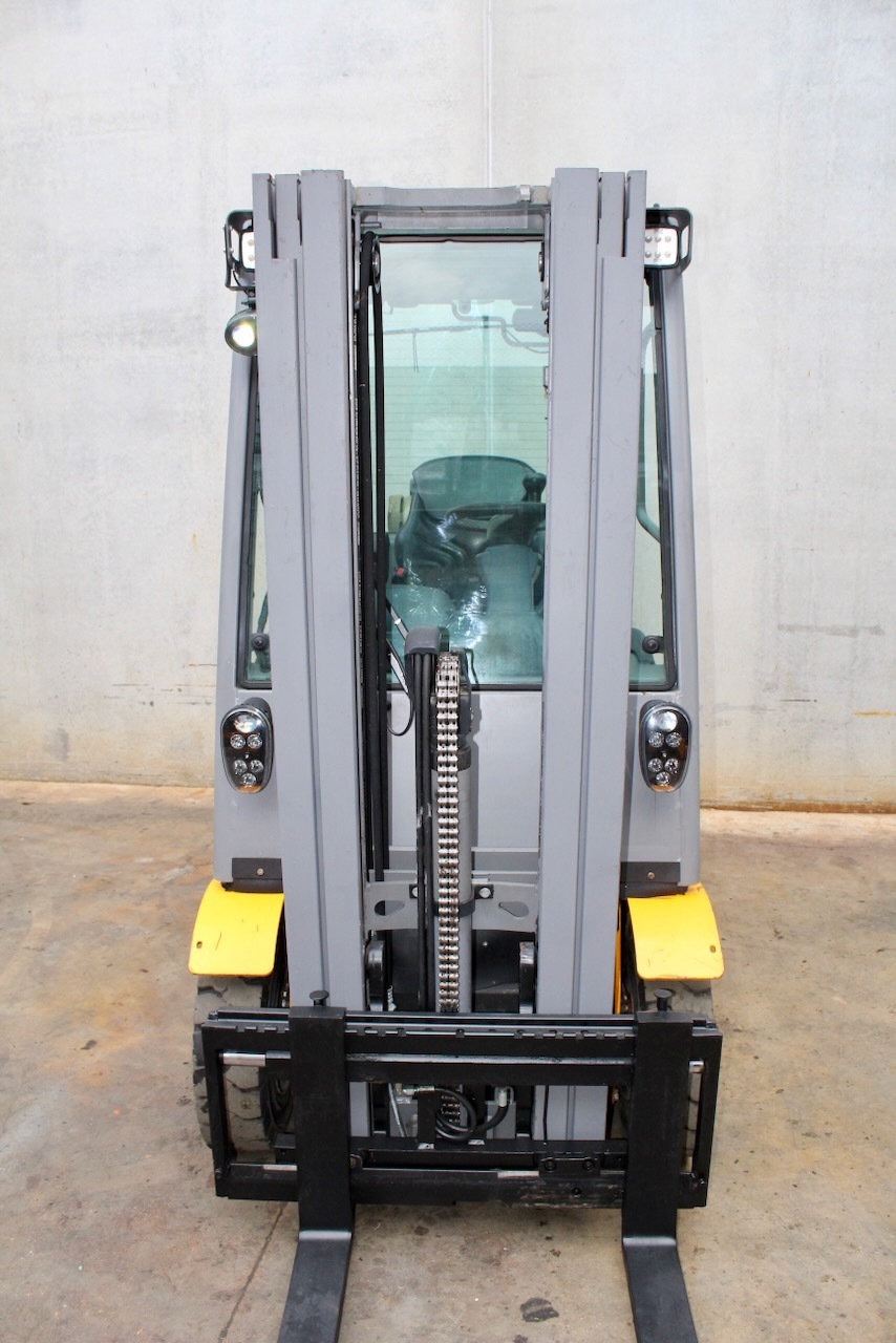 Jungheinrich TFG 320s 440 DZ Load capacity: 2.000 Kg Lifting height: 4.640 mm Mast: Triplex Fork: 1.150 mm Build height: 2.120 mm Motorization: Gas Battery: Charger: No charger included Good condition, Integrated side shift, Half-cabin, Permanent Rear-view camera. Reference number: 7426