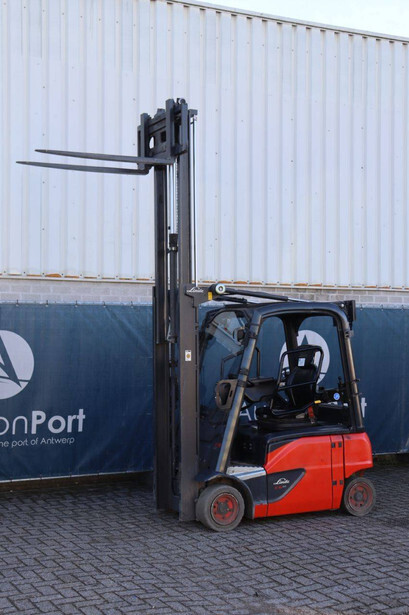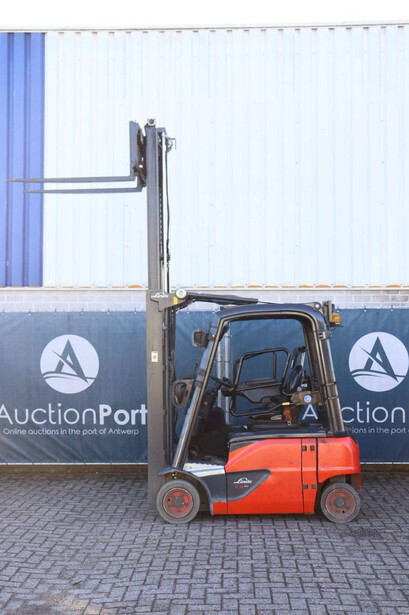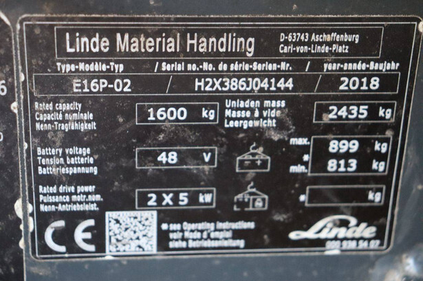Brand: Linde Type: E16P-02 Serial number: H2X386J04144 Year of construction: 2018 Fuel: Electric Mast type: Duplex Sideshift: Yes Lifting capacity: 1600 kg Operating hours read: 11388 h Machine weight: 3334 kg Tires: Solid tires Color: red