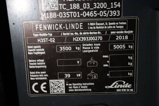 Brand: Linde Type: H35T-02 Serial number: H2X393J00270 Year of construction: 2018 Fuel: LPG Mast type: Triplex Sideshift: Yes Lifting capacity: 3500 kg Lifting height: 7000 mm Operating hours read: 5965 h Machine weight: 5005 kg Tires: Solid tires Color: red
