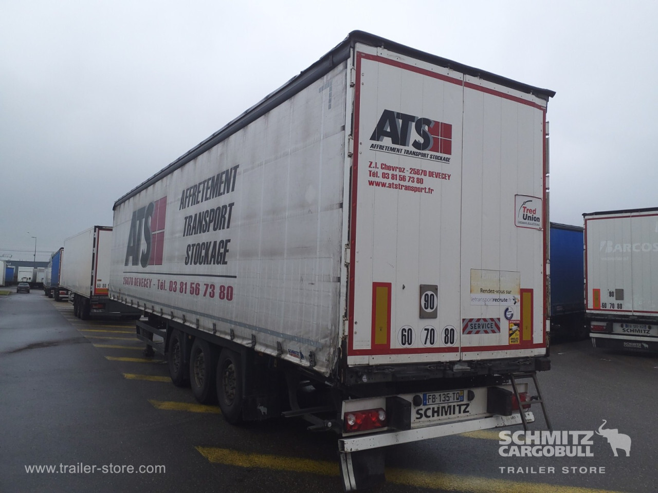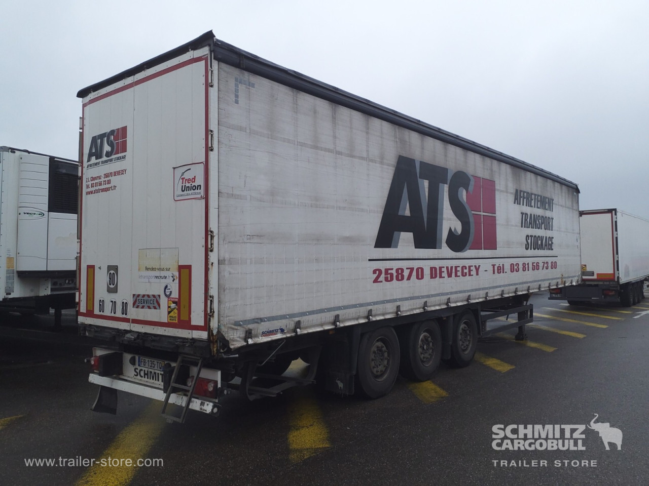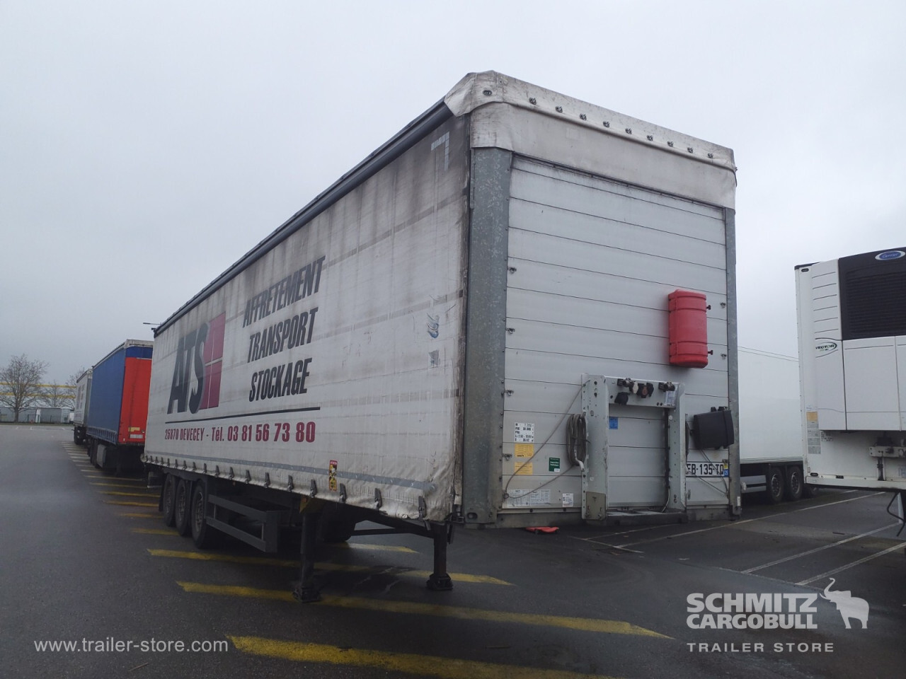Remarks: **Safety**\\Rear underrun, Antilock Braking System ABS, Fire extinguisher holder\\\\**Exterior**\\Air suspension, Toolbox, Spare wheel carrier double, Bolted chassis, Sliding roof, 1x15 and 2x7 pin plug, Antispray\\\\**Cargo securing**\\DIN EN 12642 (code XL) certificate, Punched load securing side rave, Wooden - support slats\\\\**Brake system**\\Disc brake, Schmitz ROTOS\\\\**Floor**\\Wooden floor, Coil long\\\\**Loading area**\\Length 13.620 mm, Width 2.480 mm, Height 2.780 mm, Volume 93 m³\\\\**Tyre sizes**\\1. Achse: 385/65 R22.5 , Tread depth: 7 mm / 6 mm, 2. Achse: 385/65 R22.5 , Tread depth: 7 mm / 5 mm, 3. Achse: 385/65 R22.5 , Tread depth: 7 mm / 6 mm\\\\**Other dimensions and weights**\\GVW: 38.000 kg\\\\----Disques de frein Essieu 1 39 mmPlaquettes de frein Essieu 1 40% d'usure Disques de frein Essieu 2 43, 5 mmPlaquettes de frein Essieu 2 20% d'usure Disques de frein Essieu 3 40 mmPlaquettes de frein Essieu 3 40% d'usureMines 10/2026 -