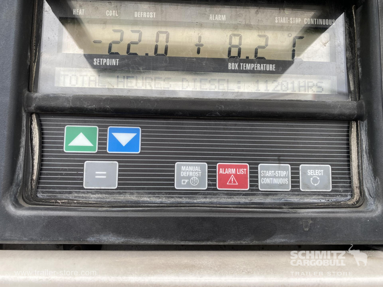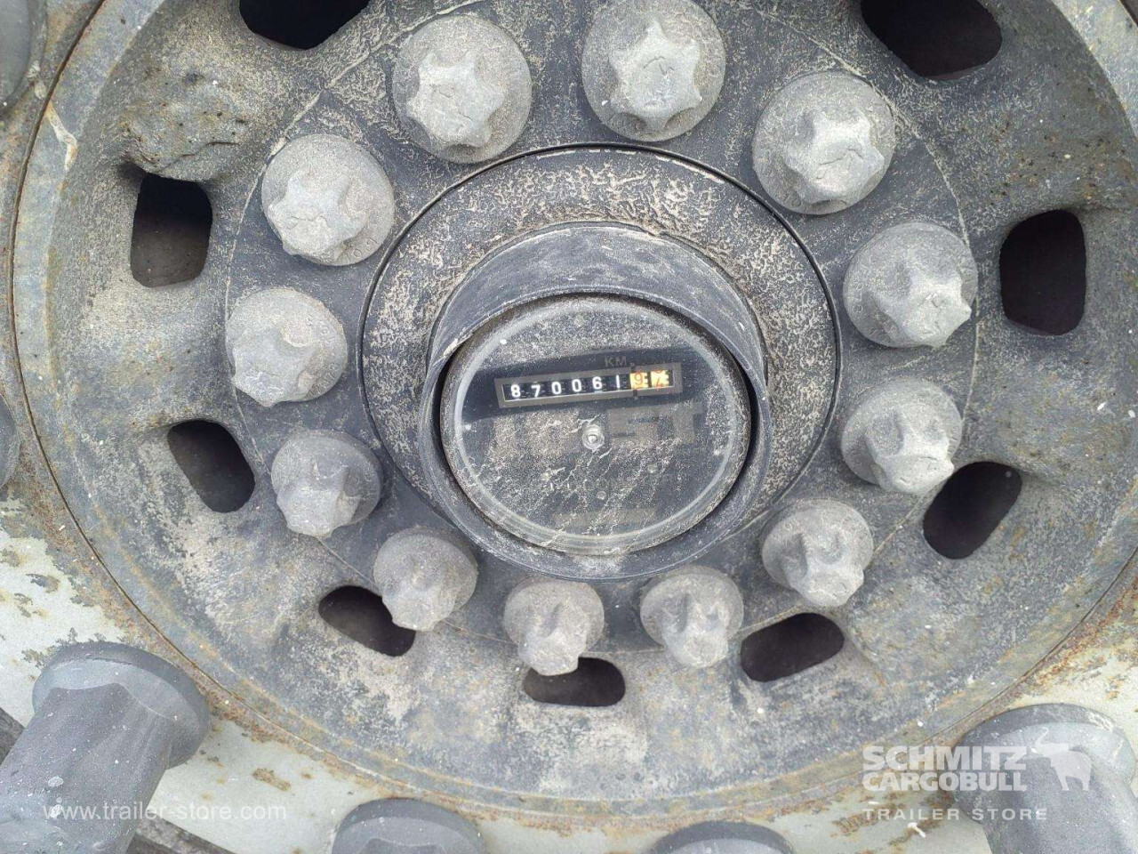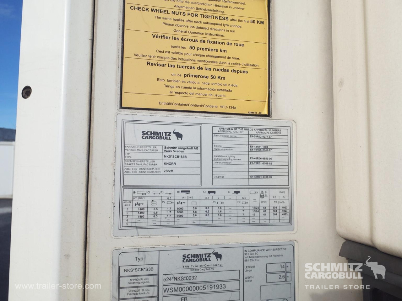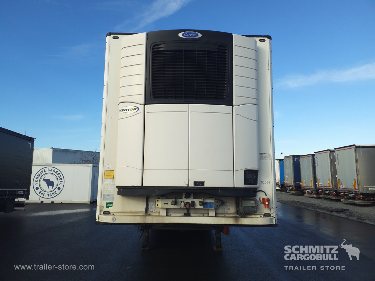 Remarks: **Safety**\\Rear underrun, Antilock Braking System ABS, Fire extinguisher holder, Hubodometer, Telematics system\\\\**Interior**\\Temperature recorder\\\\**Exterior**\\Air suspension, Lift axle front and rear, Pallet box, Spare wheel carrier double, Bolted chassis, Gantry doors, 1x15 and 2x7 pin plug, Antispray, International customs seals\\\\**Cargo securing**\\Load securing rail\\\\**Brake system**\\Disc brake, Schmitz ROTOS\\\\**Floor**\\Aluminum floor\\\\**Wand**\\Stirnwand verstärkt\\\\**Wall**\\Frontwall recess for cooling\\\\**Cooling unit**\\Carrier Vector 1950\\\\**Loading area**\\Length 13.410 mm, Width 2.460 mm, Height 2.650 mm, Volume 87 m³\\\\**Tyre sizes**\\1. Achse: 385/65 R22.5 , Tread depth: 4 mm / 4 mm, 2. Achse: 385/65 R22.5 , Tread depth: 6 mm / 7 mm, 3. Achse: 385/65 R22.5 , Tread depth: 8 mm / 7 mm\\\\**Other dimensions and weights**\\Payload: 28.938 kg, GVW: 38.000 kg\\\\----