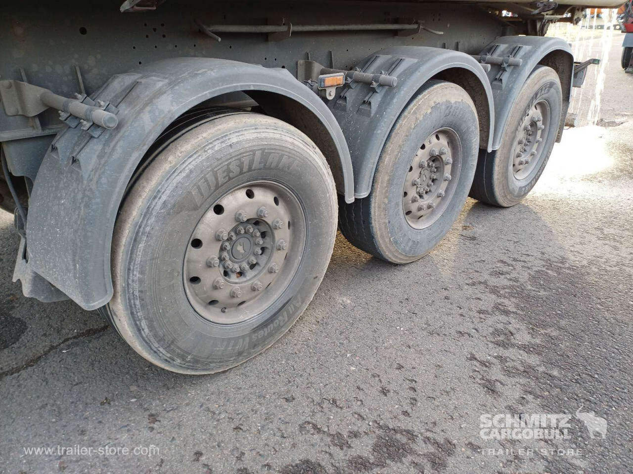 Remarks: **Safety**\\Hinged rear underrun, Antilock Braking System ABS\\\\**Exterior**\\Air suspension, Lift axle front, Exterior pendulum tailgate, Roof rolling tarpaulin, Access platform, 1x15 and 2x7 pin plug, Antispray, Light alloy rims\\\\**Brake system**\\Disc brake, Schmitz ROTOS\\\\**Loading area**\\Length 7.500 mm, Width 2.440 mm, Height 1.350 mm, Volume 24 m³\\\\**Tyre sizes**\\1. Achse: 385/65 R22.5 , Tread depth: 12 mm / 11 mm, 2. Achse: 385/65 R22.5 , Tread depth: 8 mm / 10 mm, 3. Achse: 385/65 R22.5 , Tread depth: 12 mm / 7 mm\\\\**Other dimensions and weights**\\GVW: 36.000 kg\\\\----