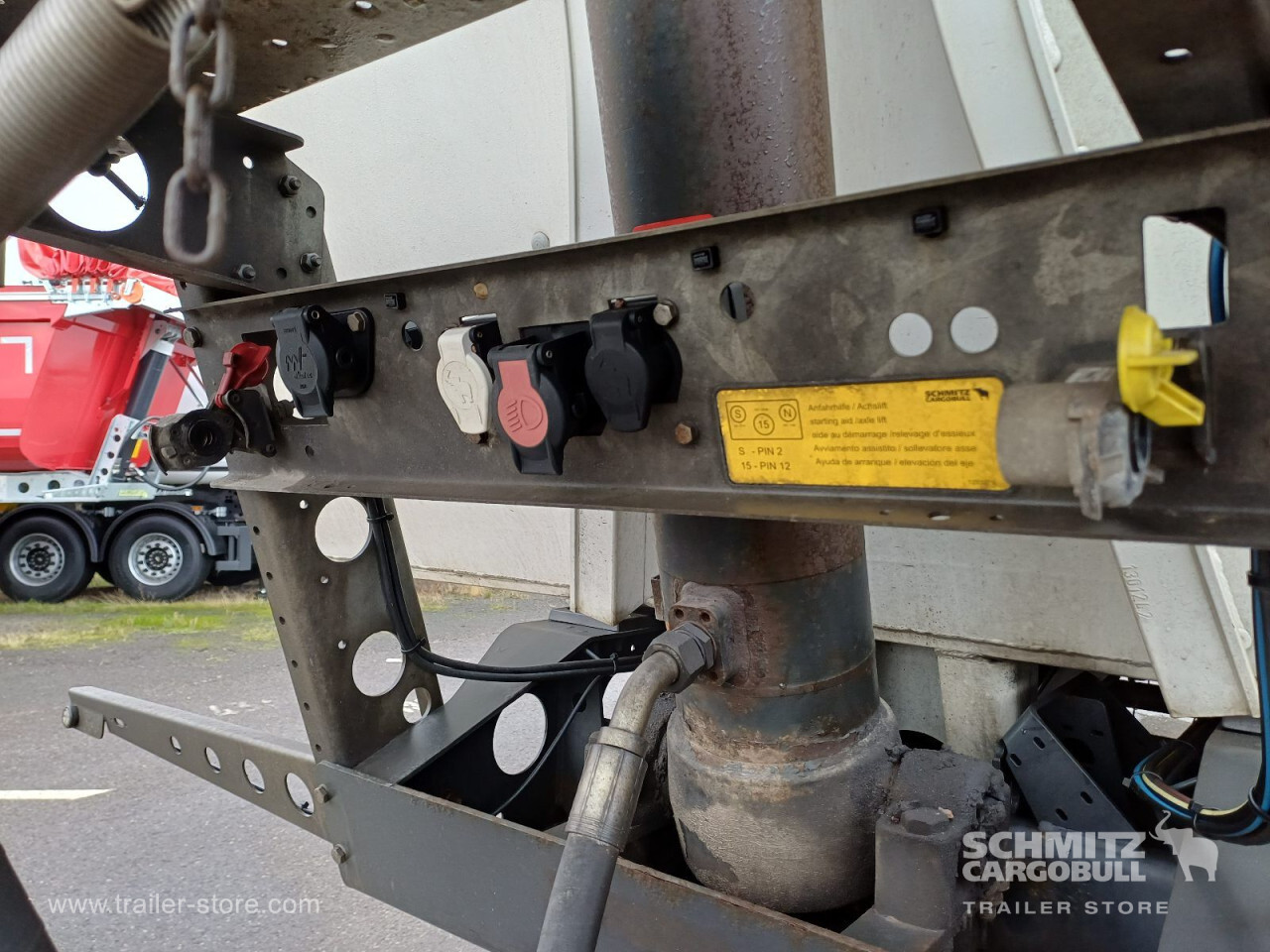 Remarks: **Safety**\\Hinged rear underrun, Antilock Braking System ABS\\\\**Exterior**\\Air suspension, Lift axle front, Exterior pendulum tailgate, Roof rolling tarpaulin, Access platform, 1x15 and 2x7 pin plug, Antispray, Light alloy rims\\\\**Brake system**\\Disc brake, Schmitz ROTOS\\\\**Loading area**\\Length 7.500 mm, Width 2.440 mm, Height 1.350 mm, Volume 24 m³\\\\**Tyre sizes**\\1. Achse: 385/65 R22.5 , Tread depth: 13 mm / 9 mm, 2. Achse: 385/65 R22.5 , Tread depth: 13 mm / 15 mm, 3. Achse: 385/65 R22.5 , Tread depth: 14 mm / 9 mm\\\\**Other dimensions and weights**\\GVW: 36.000 kg\\\\----
