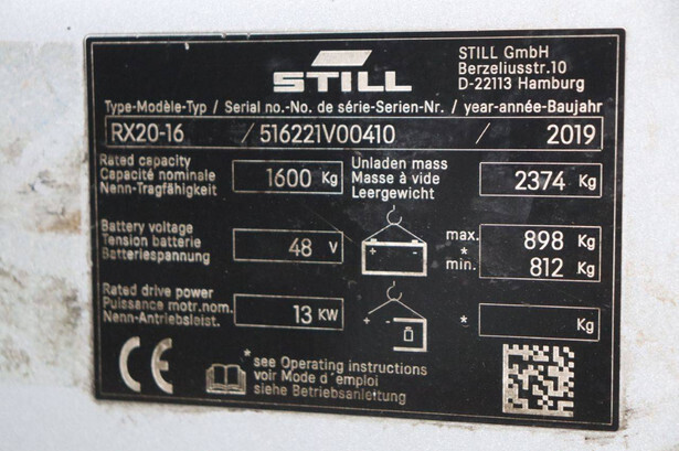 Brand: Still Type: RX20-16 Serial number: 516221V00410 Year of construction: 2019 Fuel: Electric Mast type: Triplex Sideshift: Yes Lifting capacity: 1600 kg Lifting height: 5220 mm Operating hours read: 12126 h Machine weight: 3272 kg Tires: Solid tires Color: orange