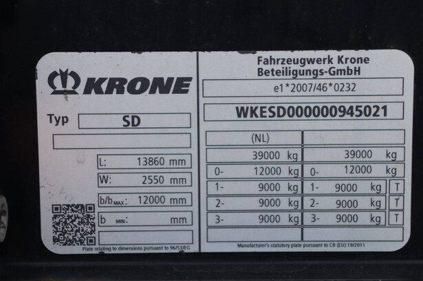 Brand: Krone Type: SD Chassis number: WKESD000000945021 Year of construction: 2020 MTM: 39000 kg Number of axles: 3 Brakes: Disc brakes