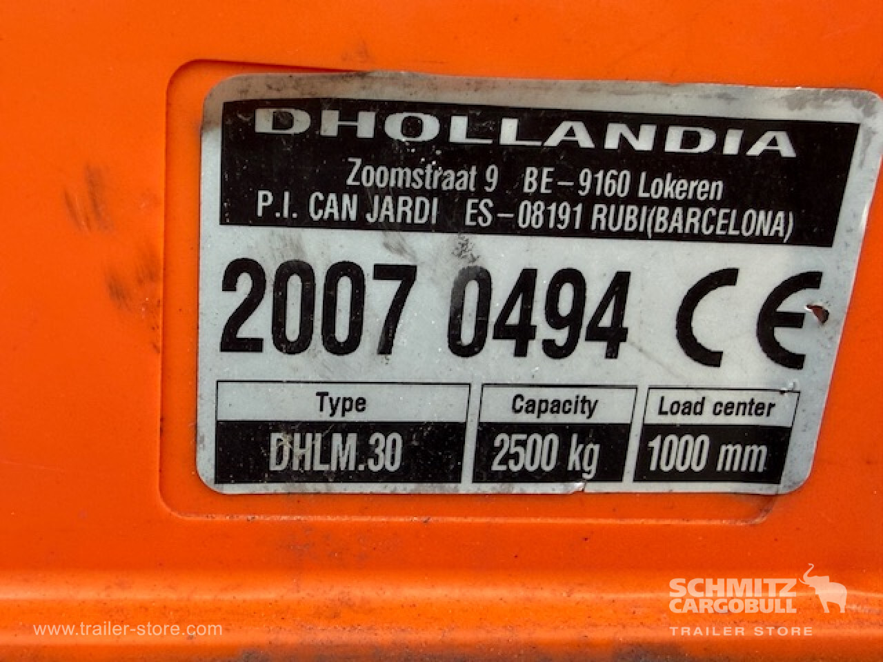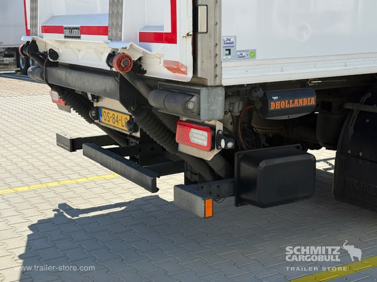 Remarks: **Safety**\\Rear underrun, Antilock Braking System ABS\\\\**Interior**\\ISO partition wall without ventilators\\\\**Exterior**\\Column steel taillift: Dhollandia 2500KG en Batterie, Toolbox, Command steering, 1x15 pin plug, Antispray, Twin tyres\\\\**Cargo securing**\\Load securing rail, Load securing rail roof\\\\**Brake system**\\Disc brake, SAF\\\\**Floor**\\Plastic floor\\\\**Wall**\\Wall thickness45 mm\\\\**Cooling unit**\\Carrier Vector HE 19 MT, Diesel/Elektro, 3.700 Operating hours Diesel, 7 Operating hours electric\\\\**Tyre sizes**\\1. Achse: 275/70 22.5 , twin wheels\\\\----