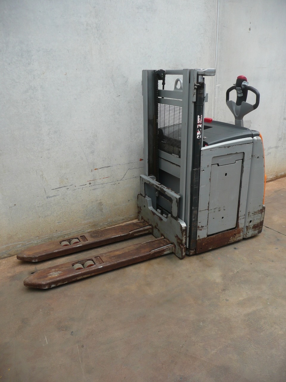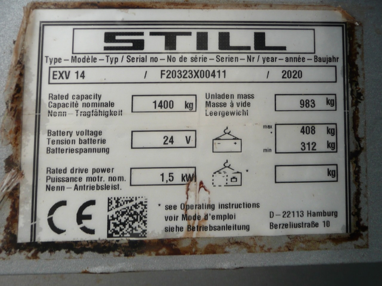 Still EXV 14 C LI-ION Load capacity: 1.400 Kg Lifting height: 1.920 mm Mast: Duplex Fork: 1.150 x 560 mm Build height: 1.420 mm Motorization: Electric Battery: 23,1v/164Ah Charger: 24 v Good condition, Lithium battery, Electric steering wheel, Some rusty areas Reference number: 7122
