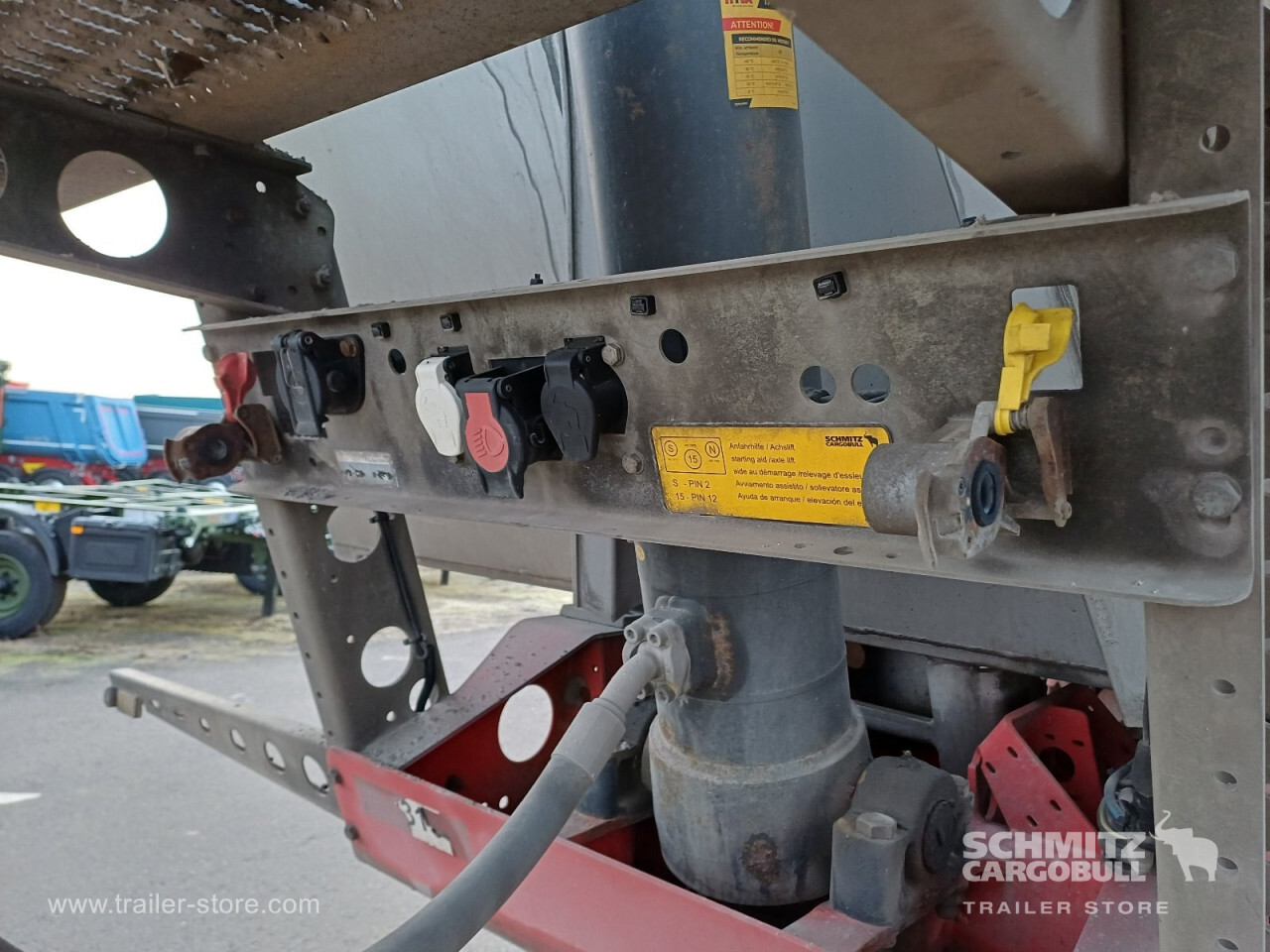 Remarks: **Safety**\\Hinged rear underrun, Antilock Braking System ABS, Brake wear indicator\\\\**Exterior**\\Air suspension, Lift axle front, Exterior pendulum tailgate, Roof rolling tarpaulin, Access platform, 1x15 and 2x7 pin plug, Antispray, Light alloy rims\\\\**Brake system**\\Disc brake, Schmitz ROTOS\\\\**Loading area**\\Length 7.500 mm, Width 2.440 mm, Height 1.500 mm, Volume 27 m³\\\\**Tyre sizes**\\1. Achse: 385/65 R22.5 , Tread depth: 6 mm / 8 mm, 2. Achse: 385/65 R22.5 , Tread depth: 11 mm / 6 mm, 3. Achse: 385/65 R22.5 , Tread depth: 7 mm / 8 mm\\\\**Other dimensions and weights**\\GVW: 36.000 kg\\\\----